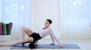 起身变成侧卧的姿势,用单侧的大腿外侧压住泡沫轴,同样将身体的重量尽力放在泡沫轴上,再通过另一侧腿和前臂来回推拉身体