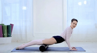 俯身趴在泡沫轴上,用大腿前侧接触泡沫轴,尽量让身体的力量压在泡沫轴上,再用前臂去来回推拉身体