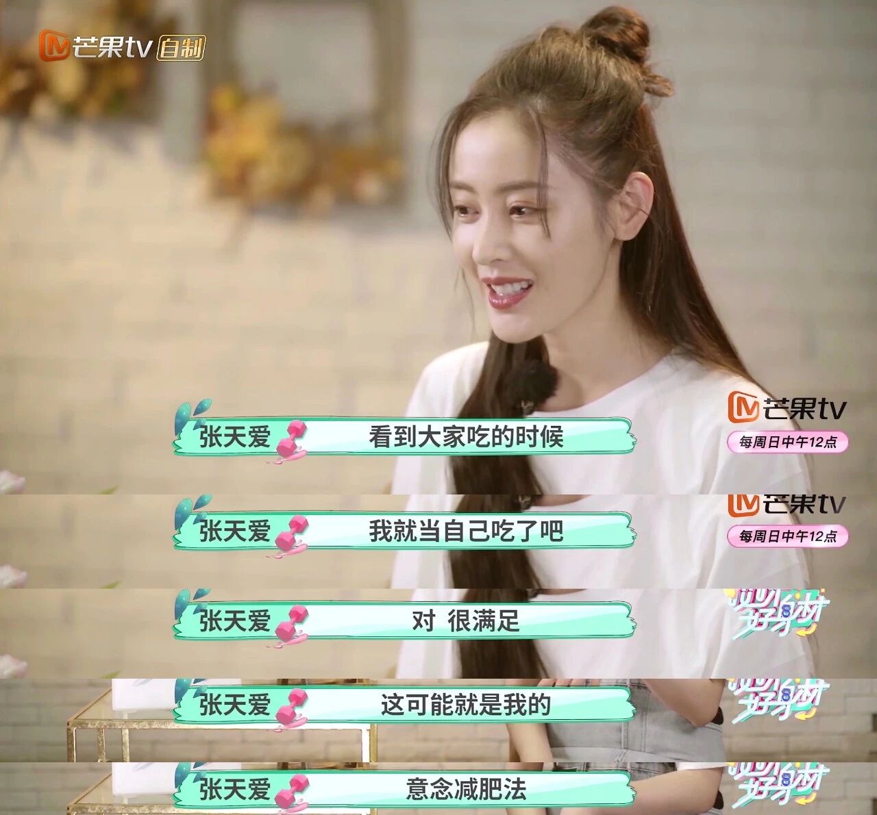 同在一个节目里的张天爱也有一套不输王菊的“意念减肥法”,也就是通过看着别人吃就当自己吃了这种心理暗示和想象来控制食欲。