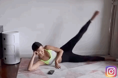 Step 1:外侧旋转抬腿,侧身躺下,右腿屈膝放在地上,左腿伸直上下摆动,运用大腿肌肉。15秒后开始划圈,然后再做另一侧。