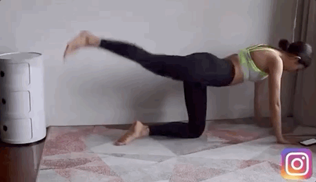 Step 4:向后踢腿:跪姿手臂伸直支撑,向后伸直右腿,收紧臀部上下摆踢,保持离地,注意每次都要用腿部发力。完成后做另一侧。