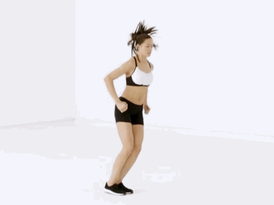 绷紧全身,左右跳动时身体跟随双脚左右摆动,起跳时手臂用力向上提带起身体。