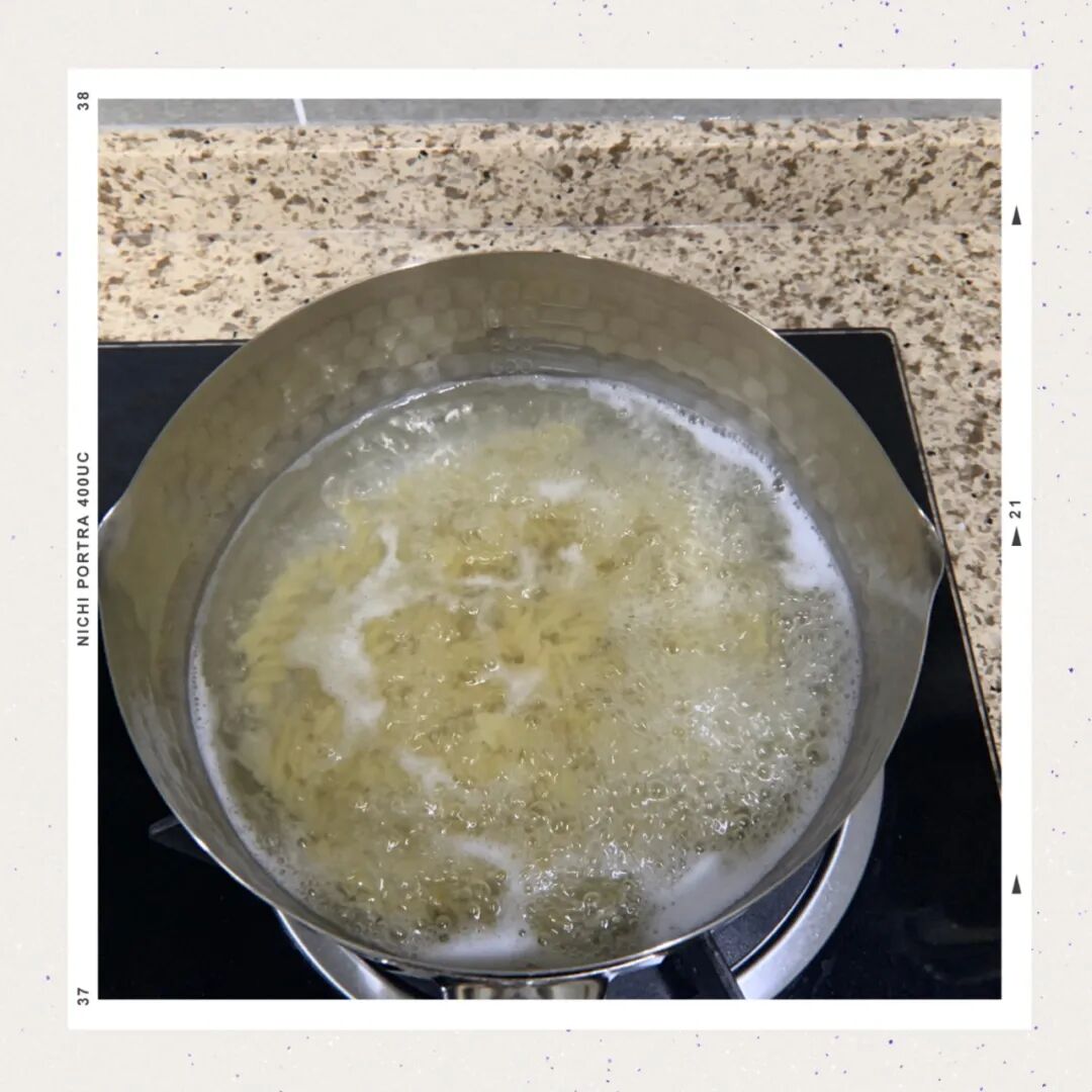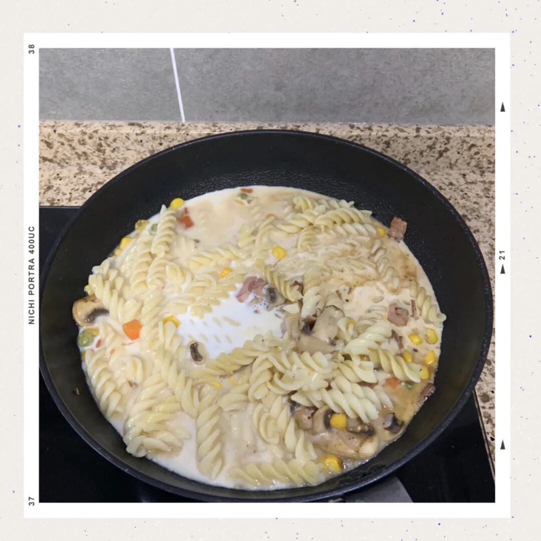 Step4:加入意面和牛奶,再加一勺生抽,煮至浓稠汤汁收干;
