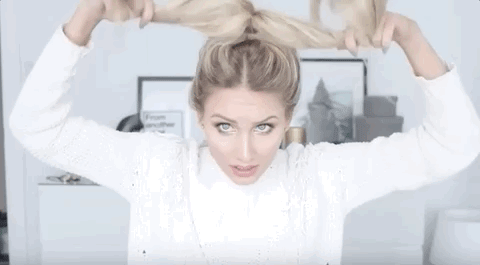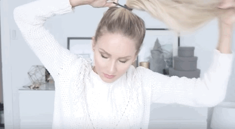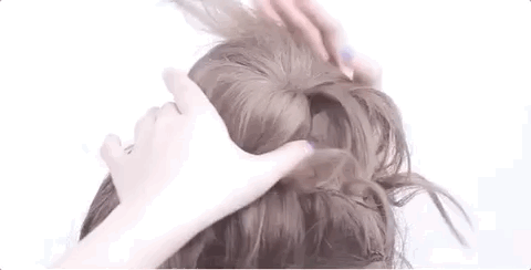 STEP 4:松开上层的头发,用手指一点一点把头发固定在你想要的位置,在扎丸子头之前用小卡子固定好下层的头发;