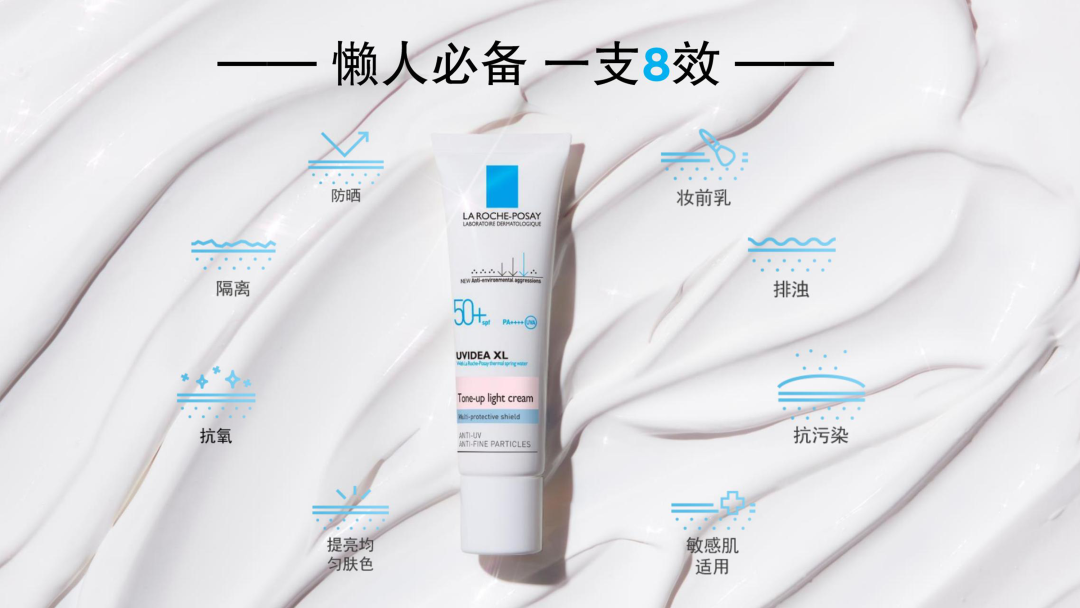 对于懒人姐妹来说,每天出门前一层紫外线防护乳、一层隔离霜、一层妆前打底霜是一件繁琐的事情,但是省略掉哪一个都不行,这不,理肤泉带来了全新的1支8效隔离提亮乳,拥有抗晒和中和肤色的效果,妆前只需这一支既能节省时间,又能做好打底。
