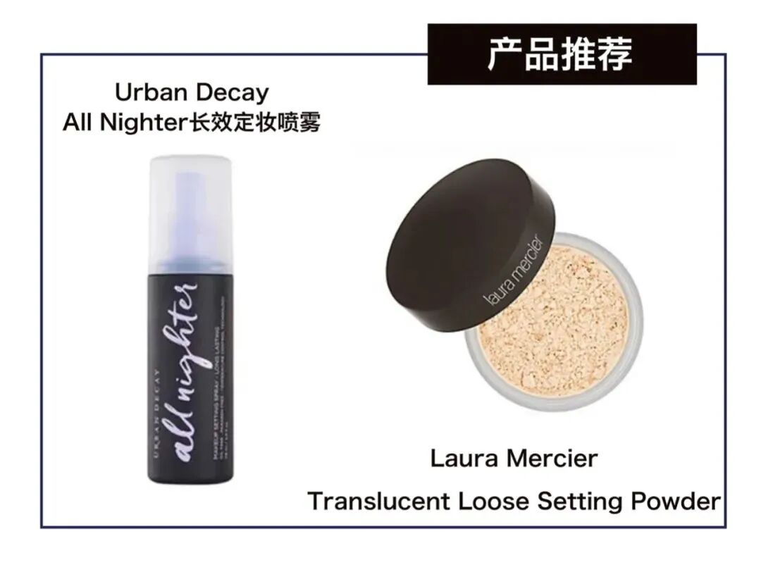 定妆产品我用的是Urban Decay的All Nighter和laura mercier的定妆散粉。两个产品联合起来,定妆效果很厉害,即便出门游玩出了很多汗,妆容也纹丝不动,很推荐给大家。