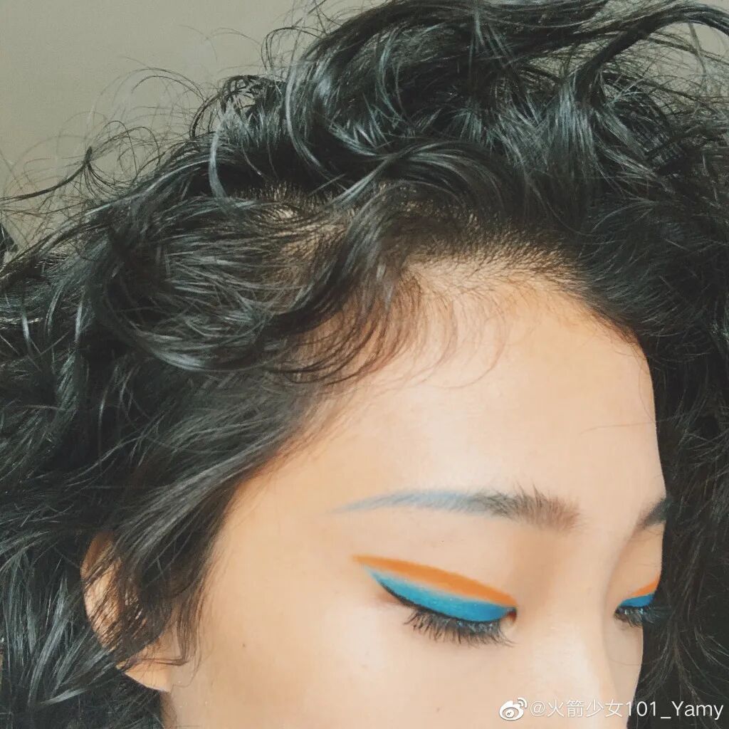 Yamy在《炙热的我们》里打造过的这款舞台妆,就是通过这点让蓝橙撞色的眼妆达到了很好的视觉冲击效果,但又不至于让她在直视镜头时显得过于夸张。