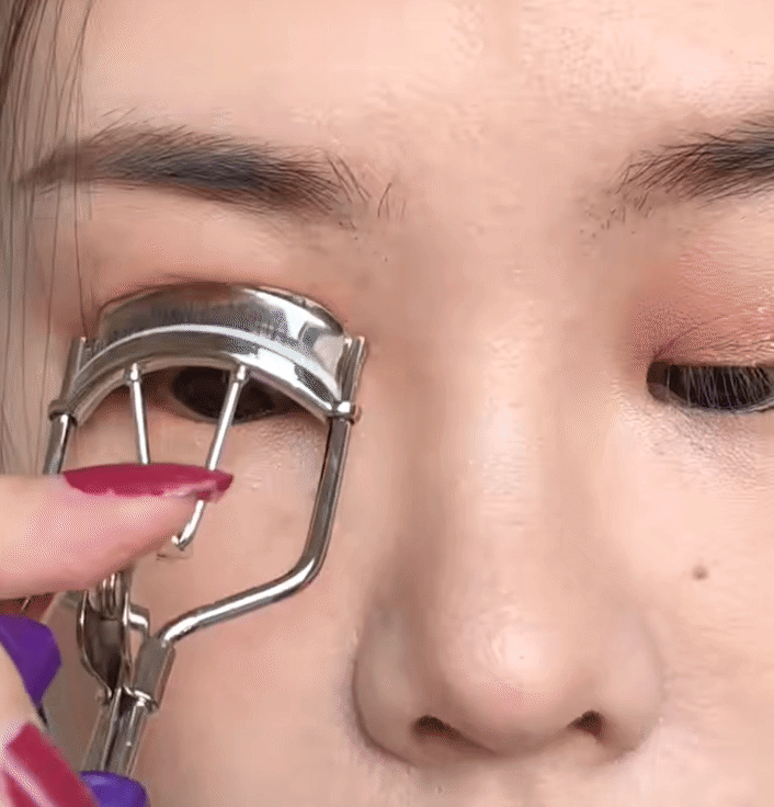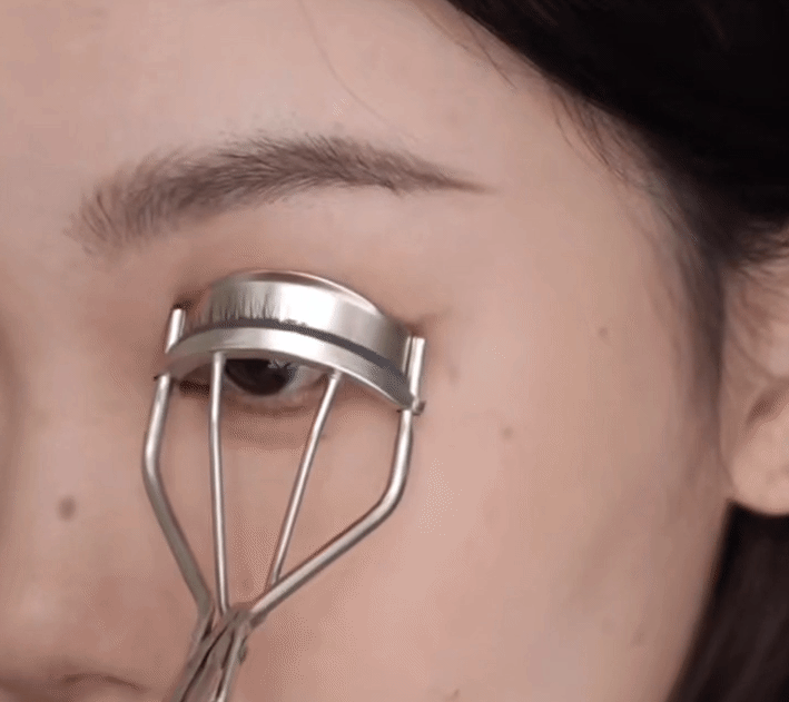 STEP 1:先用睫毛夹沿着睫毛根部把睫毛分段夹卷翘;