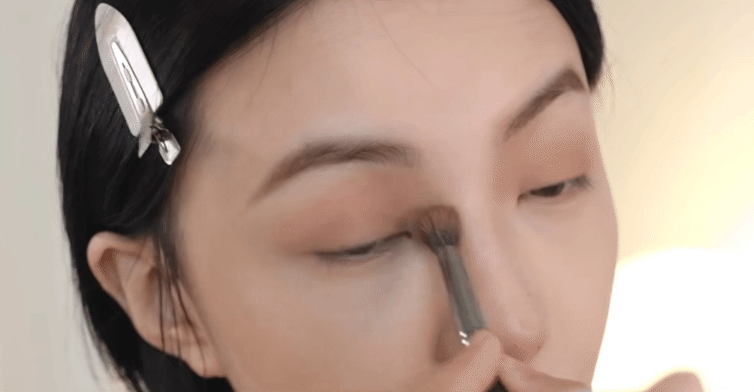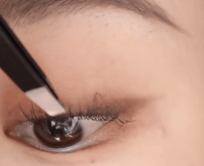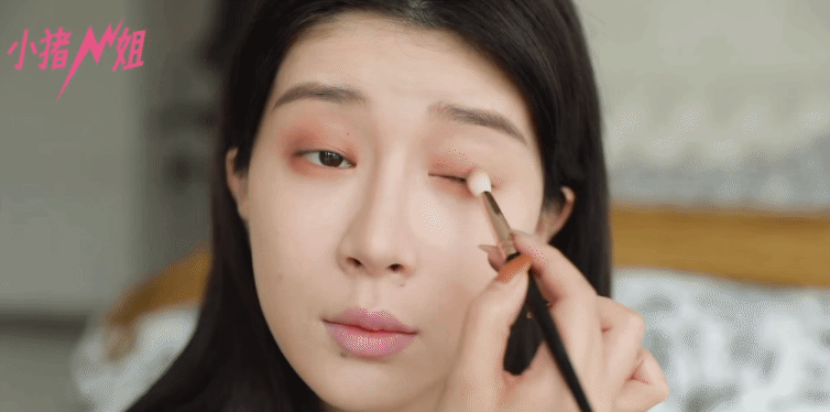 然后着重在眼头和眼尾平行晕染深色眼影,打造出加宽了眼皮的视觉效果,看着眼睛出彩很多。