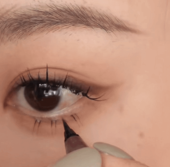 STEP 5:最后在假睫毛空隙之间用眼线液笔画出几根线条,虚实相间就很自然啦~