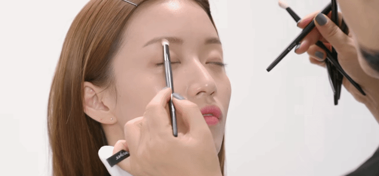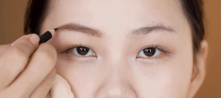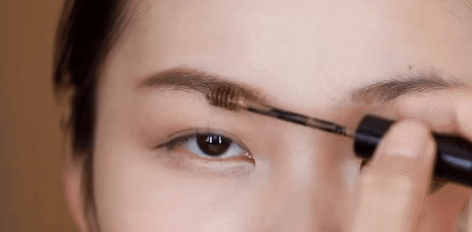 中间平缓拉出,到眉峰处停下,要先用眉笔勾勒出棱角和幅度,微微上翘,再用眉粉填充。