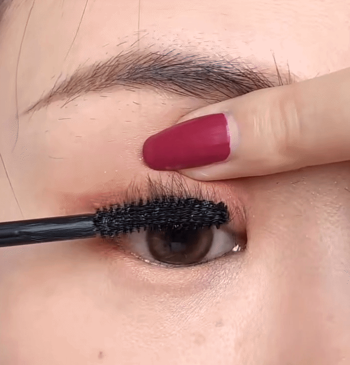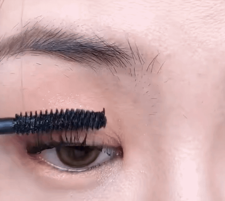 STEP 2:拿出睫毛膏,刮掉多余的膏体,从睫毛根部开始以“Z”字形向上刷;
