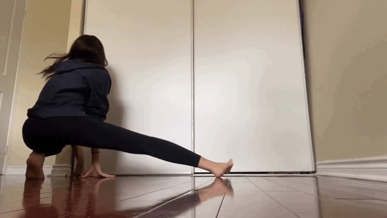 STEP 2:悬起一条腿,以点+弯曲的方式做小腿拉伸,先绷紧脚背向前压,停留3秒后再把整个脚掌展开压向自己,坚持3秒,重复做5组;