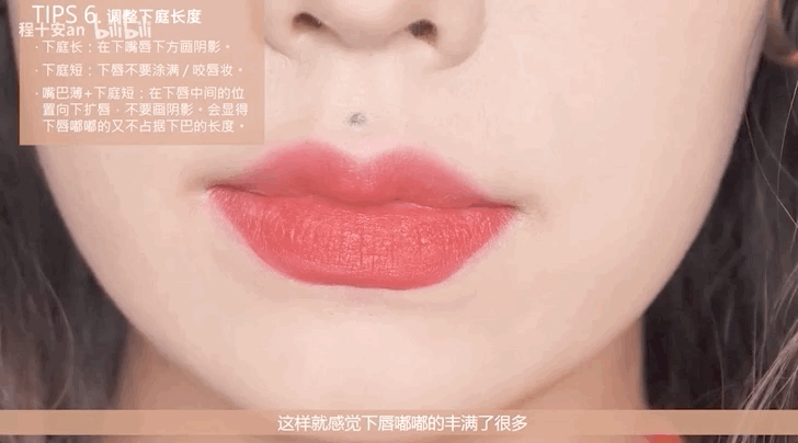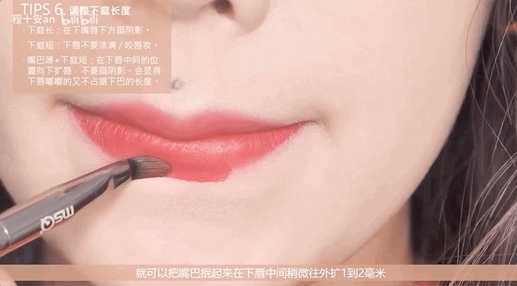 而下唇的部分也从嘴角开始下扩,上下都包住让唇形变得更加“圆”,看着可不就小了~