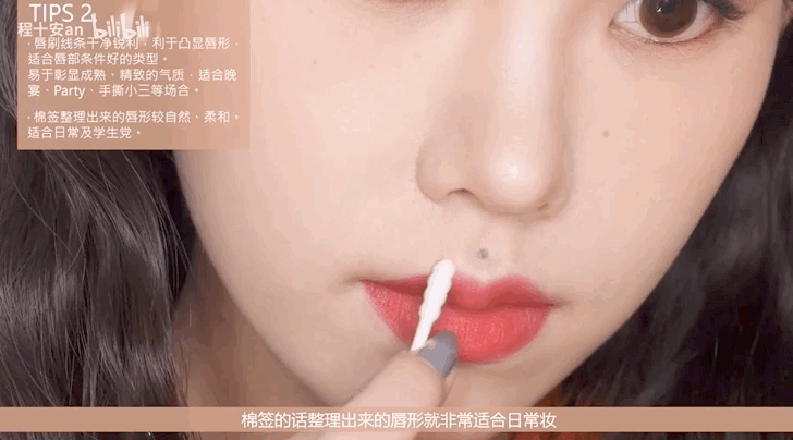 我们在打造日常妆容时,如果觉得唇膏一次性操作起来比较吃力也可以用棉签辅助,弱化唇峰到嘴角的线条感并晕染下唇,从视觉上缩短唇形。