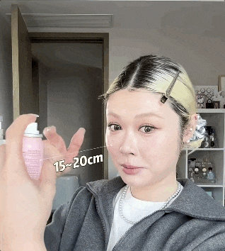 对于喜欢水光肌的姐妹来说,就不能用散粉大面积上脸了,先用定妆喷雾以画圈的方式喷满全脸,不要画十字,否则容易喷不均匀。