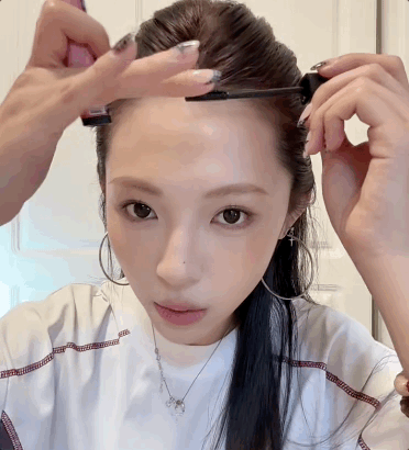 STEP 4:接着整理小碎发,用碎发神器或者发胶喷一圈作定型处理,耳边可以留出一缕耳廓碎发,增加造型感。