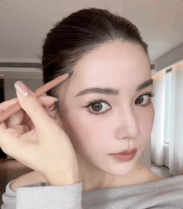 STEP 5:若想修饰发际线,选择和发色相近的眉笔,顺着发丝的走向一根根地去画,不要填得太实,保留一点真实的空隙,毛茸茸的还特别自然~