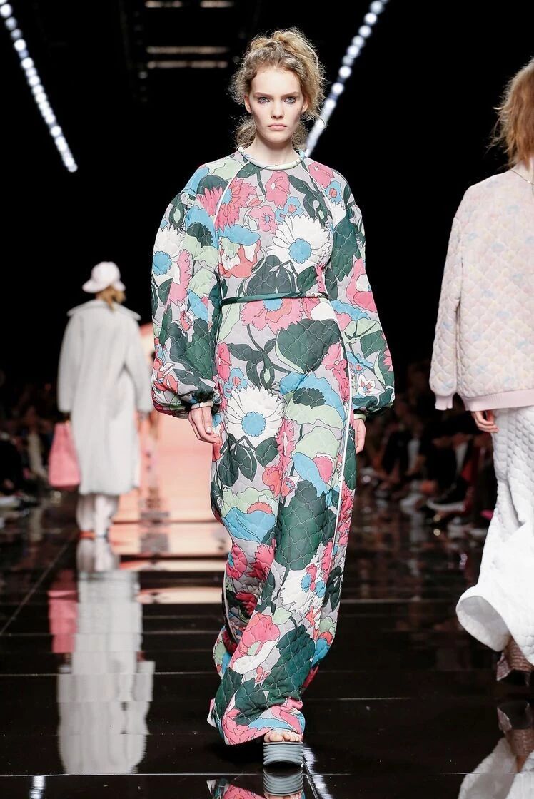 以往利落干脆的廓形也变得更加慵懒舒适,Fendi一向偏爱的蜂窝镂空装也选择了与更加柔软的针织衫一同出现。而那些有机夹棉外套上的花形状衍缝线迹,更是将这一季更女性化的趋向坦然表明。