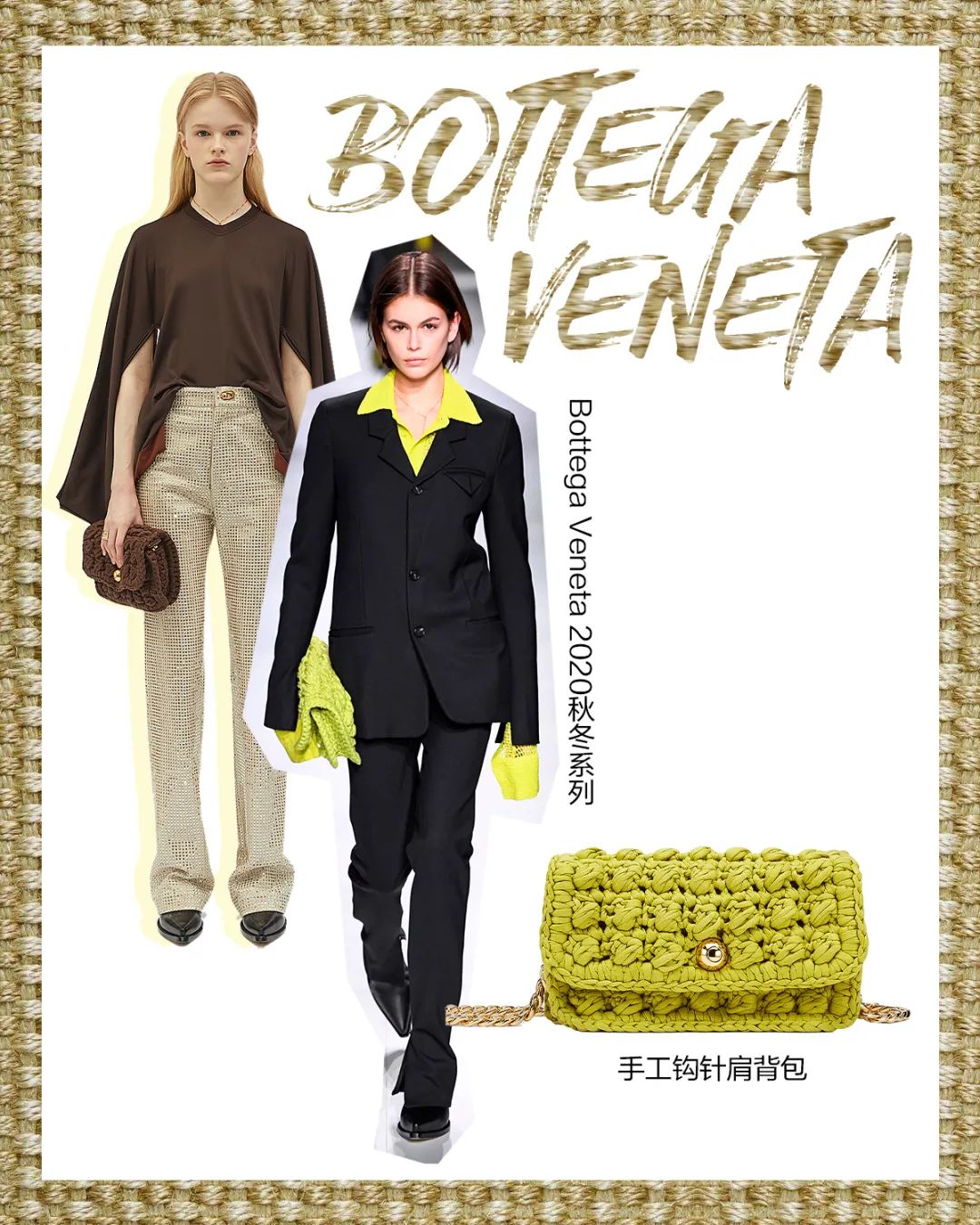 Bottega Veneta 2020秋冬系列,编织工艺依旧贯穿始终。除了大热的Pouch云朵包,这款手工钩针技艺的肩背包值得关注。柔软的包身搭配金属链条,质感的差异带来视觉与触感的冲击。牛油果绿,亮眼又高级,为秋天注入持久生机。还有百搭的咖啡色、黑色、石膏色可选。