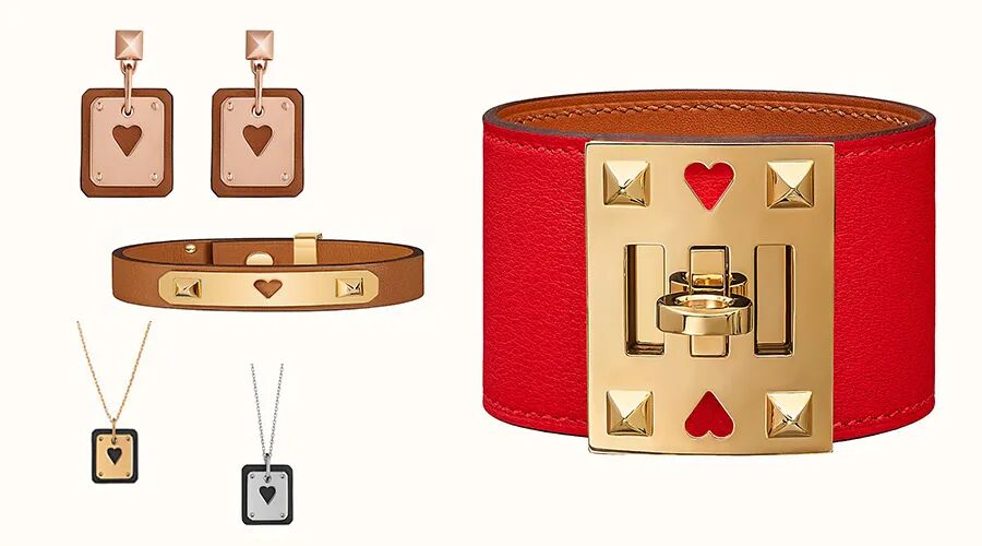 HERMÈS 全新推出2021年新配饰系列As De Coeur Collection,每款单品上都有一个可爱的小桃心,可爱满分!系列中的手镯也有多色可选,其中Swift小牛皮窄版手镯最让人“种草”!手镯选用玫瑰金色金属制成,并饰有精致的镂空爱心,很难不心动!