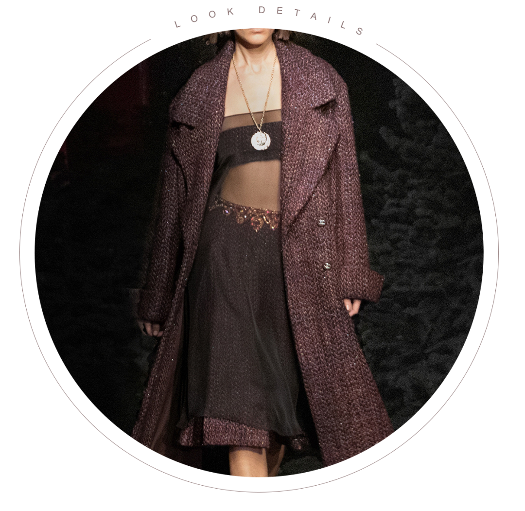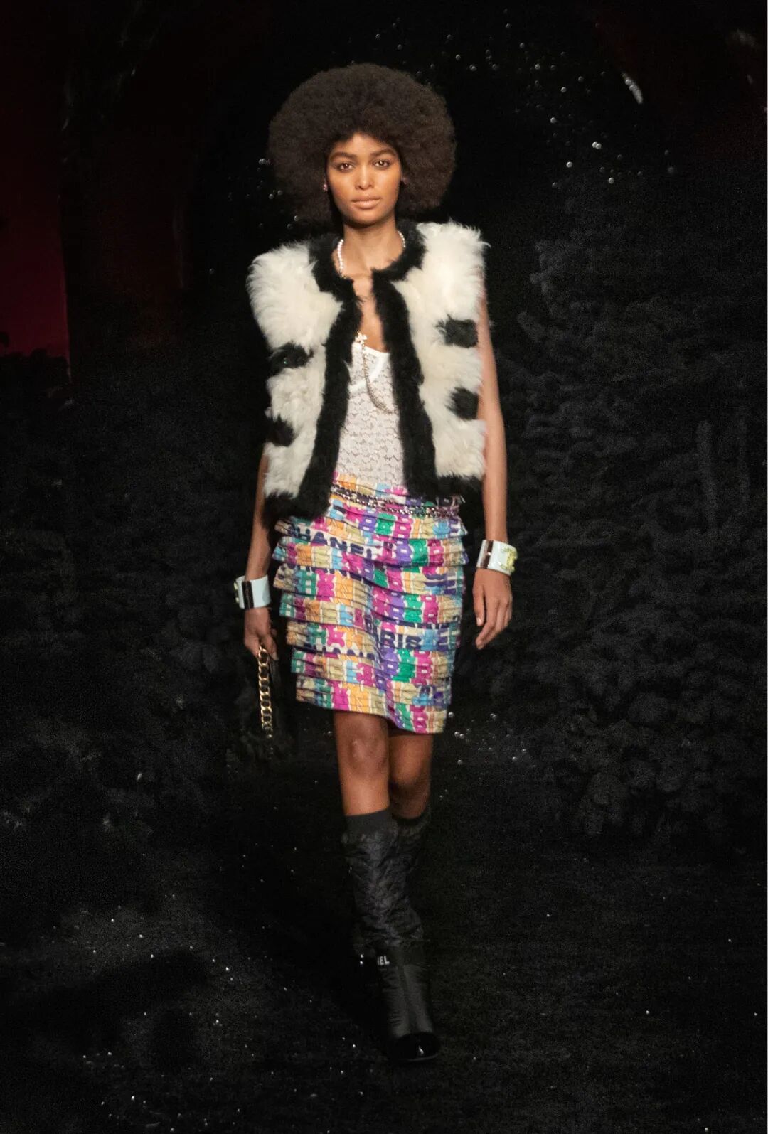 本次CHANEL 2021/22秋冬高级成衣系列延续了上一季“家庭聚会”式的轻松欢快,这一氛围也贯穿于服装细节之中,经典斜纹软呢、皮草羽绒面料与冬日运动风格相互糅合,Virginie Viard所强调的对比感也可以从斜纹软呢外套和薄纱内搭、服饰层次的材质差以及色彩的碰撞中体现。
