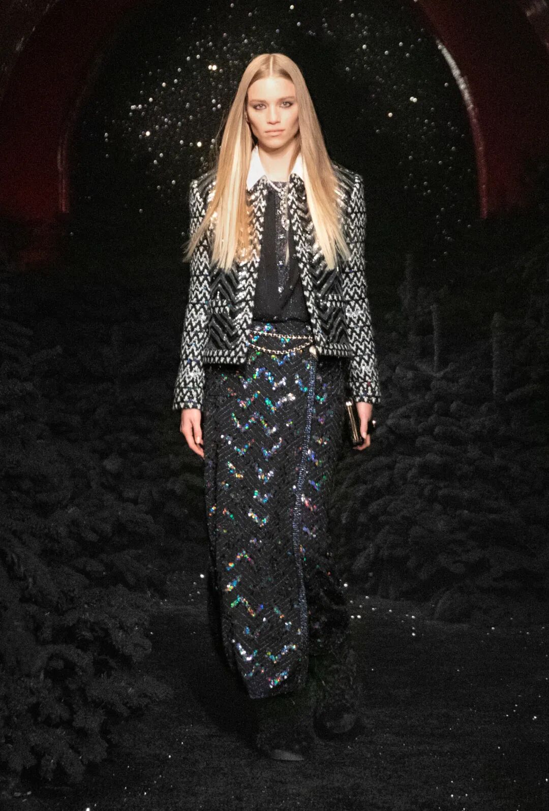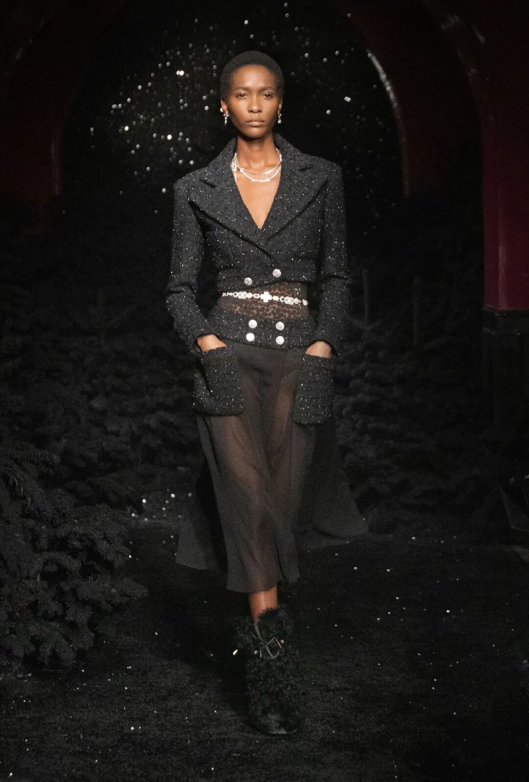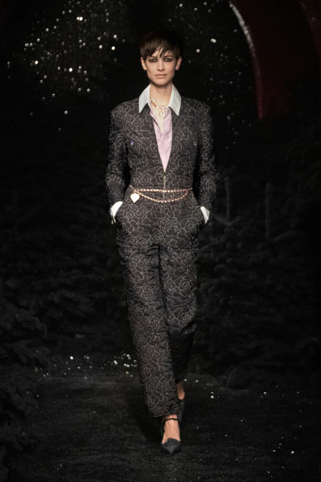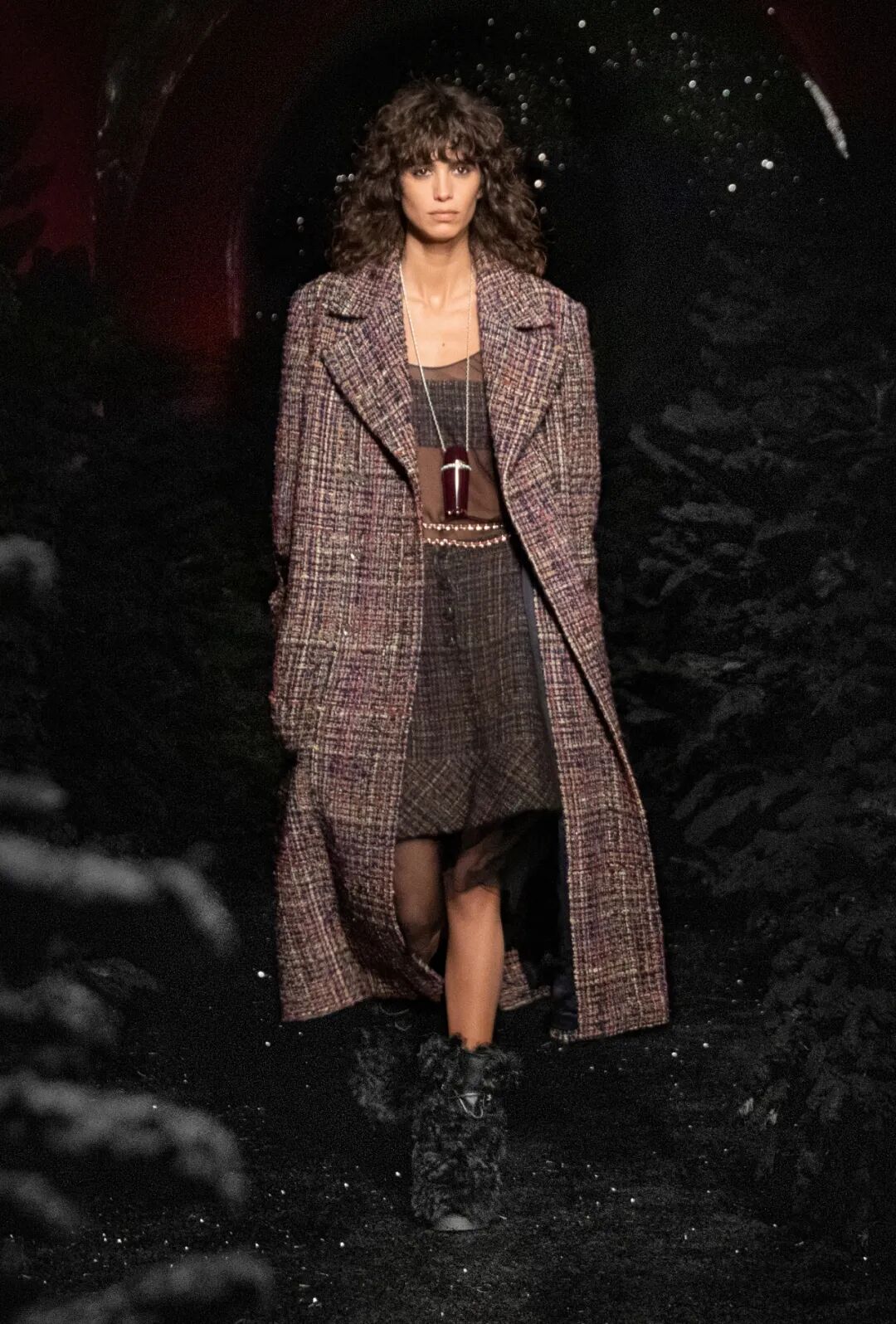 这个系列融合了两种灵感,Virginie Viard所钟爱的滑雪假日的那种氛围,和从20世纪70年代延续至今的,一种非常酷的巴黎式的时髦。她旨在营造“温暖”“生动”的秀台氛围。Virginie Viard将“对比”概念融合其中,在本系列中呈现出一场关于量感、材质与作品之间的碰撞和较量。