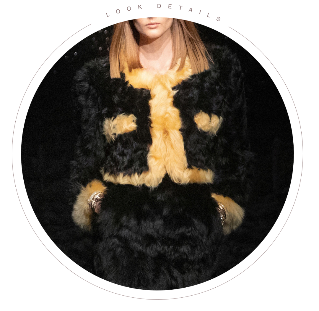 白色漆面羊皮大衣配以幻象皮草内衬相结合,材质间的相互碰撞更好诠释了“对比”的概念,款式富于变化,同时也增添了创作的多元表达。