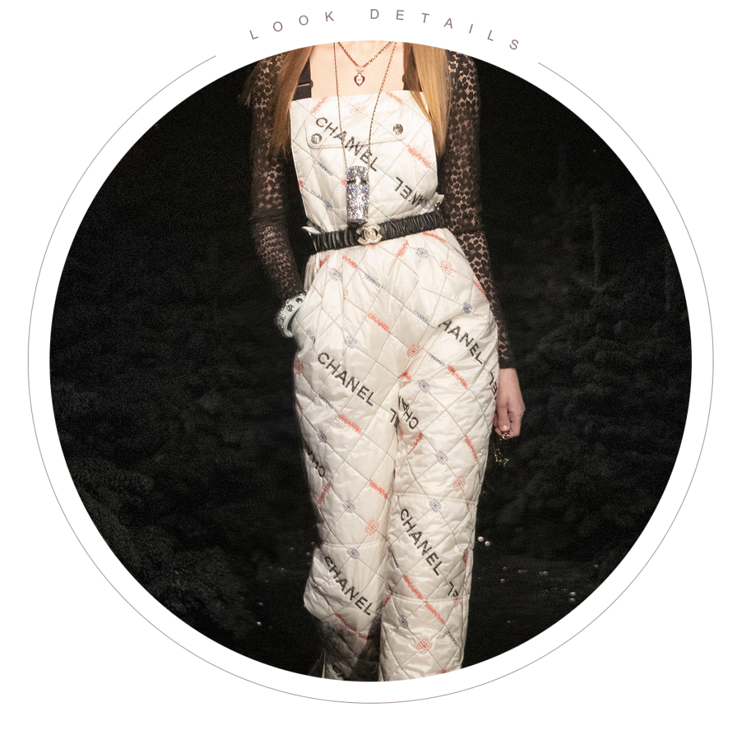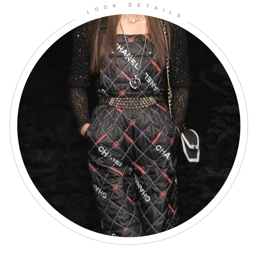 冬日滑雪Look无疑是本系列的重点,以菱格纹绗缝的工装背带裤上布满彩色印花,充满年轻活力,刻画出Virginie Viard所钟爱的滑雪假日氛围。