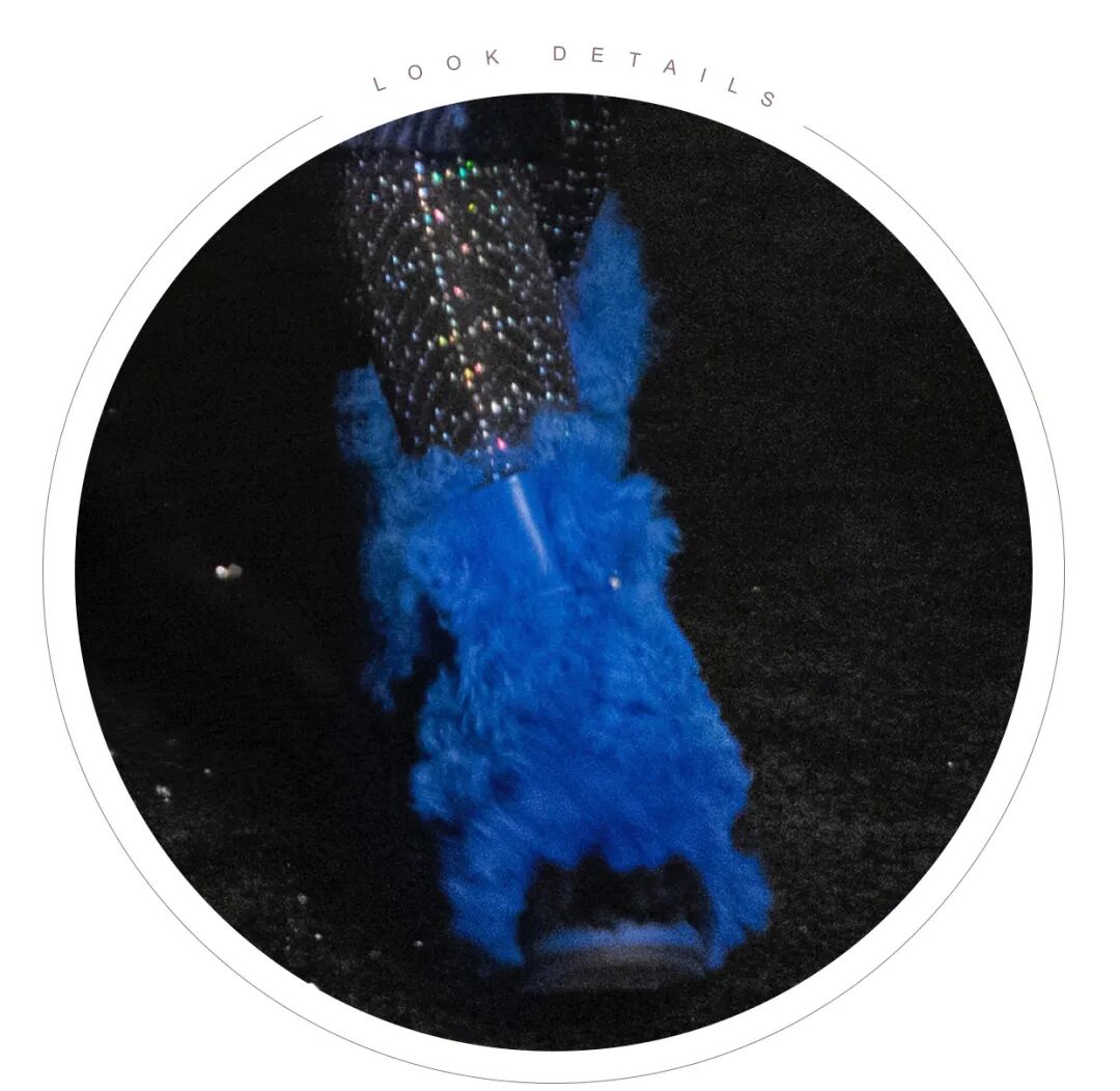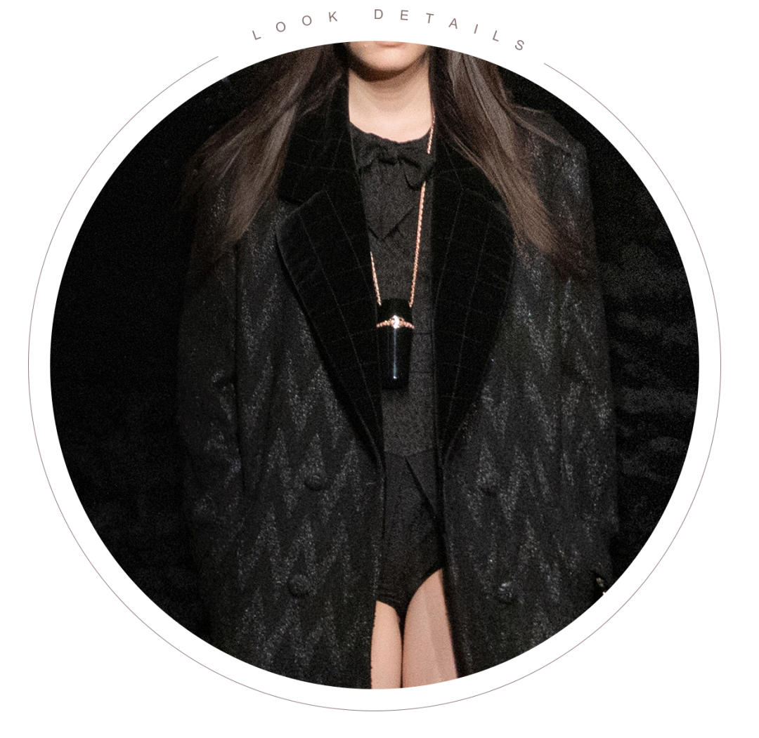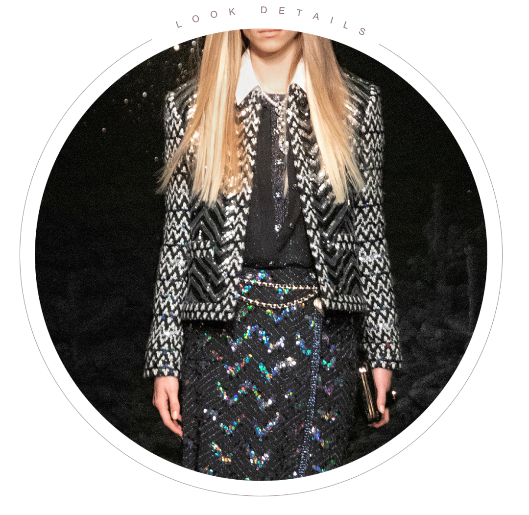 经典的黑色斜纹软呢套装再次华丽归来,精巧的格纹图案以蓝色金银线打造,让原本平淡色彩的面料,绽放了全新的光彩,在幽暗的氛围里释放闪耀光芒。