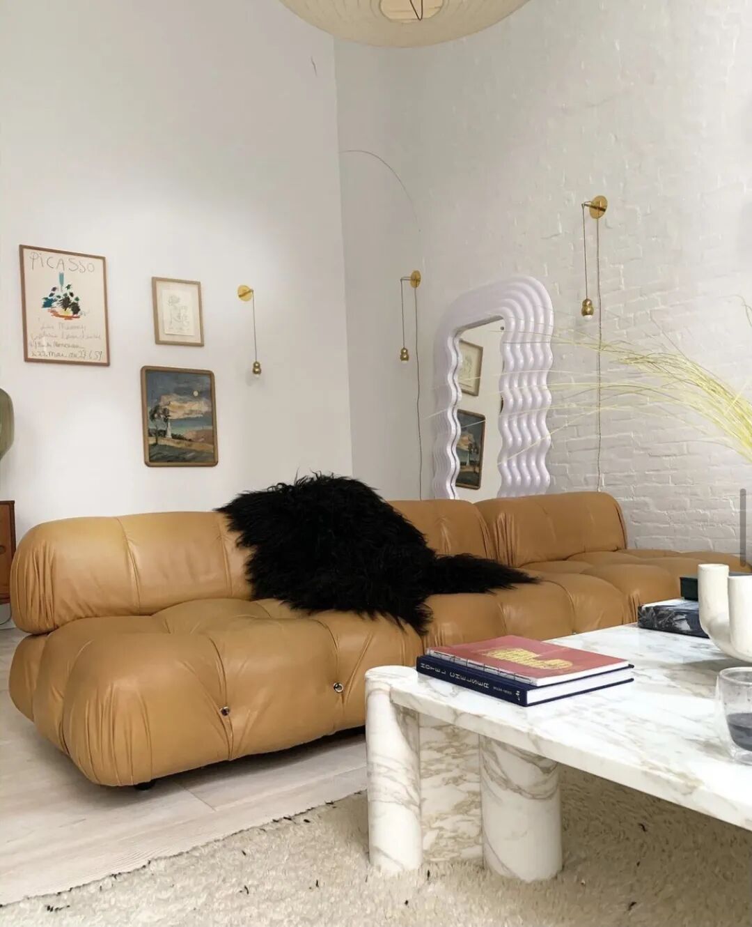 首先映入眼帘的就是这张Camaleonda沙发,是意大利建筑师Mario Bellini 20世纪70年代的作品,皮质款经典又时髦,复古的棕色在客厅中做出对比点缀。