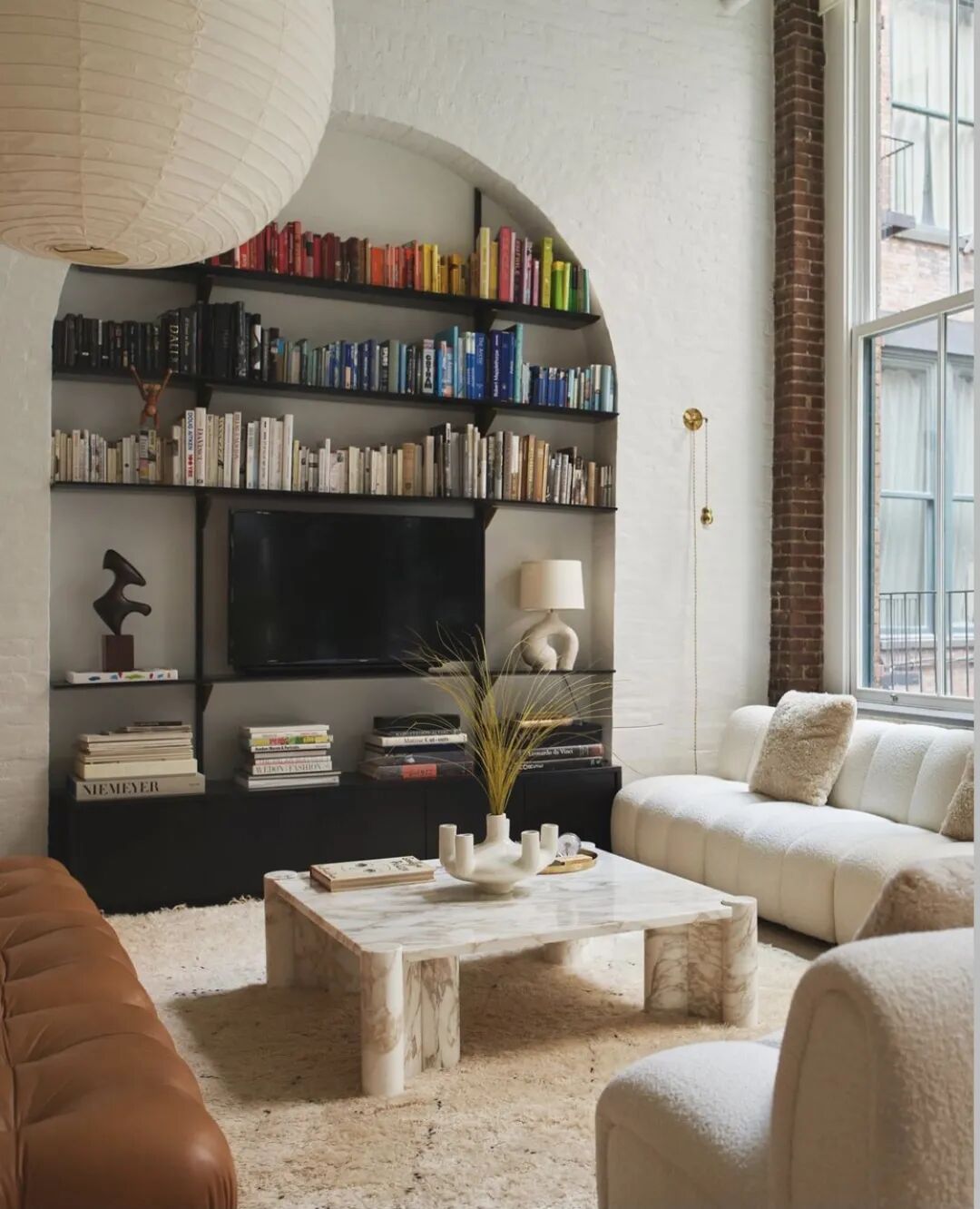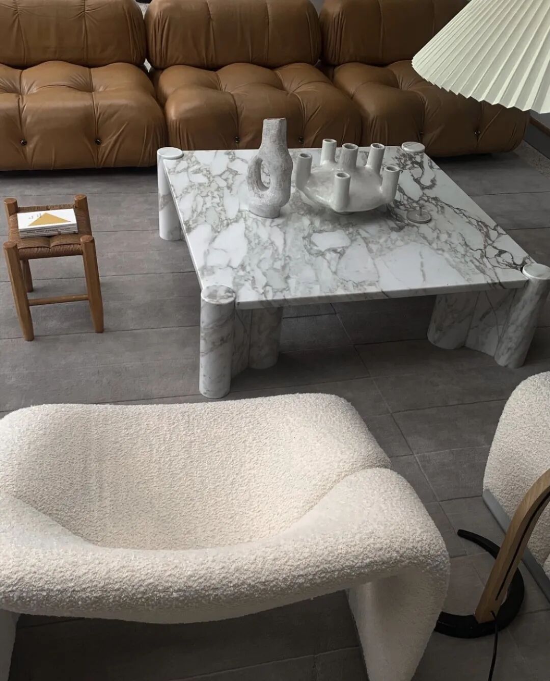 现代感大理石的茶几也是中古品,由意大利女建筑师Gae Aulenti 于60年代设计,圆柱桌角的设计经典耐看,Elsa将细节也拿捏住了,桌上的装饰花瓶别致又加强了空间感。