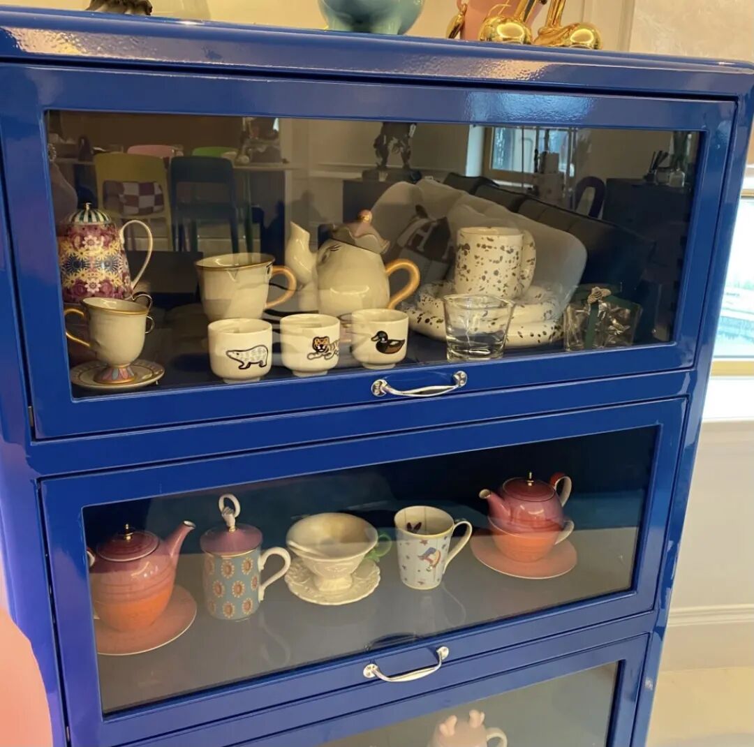 在角落的这个橱柜也很值得一看!复古的造型配上鲜艳的宝蓝色,里面装满了宋妍霏收藏的小杯子,Vintage家具的魅力就在于独一无二呀!