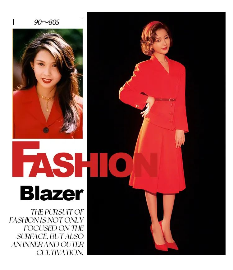从90年代港星的照片中,可以看出复古西装的几个必备元素:oversize但也要凸显腰线、衬衫领子外翻、西装和裤子同色。