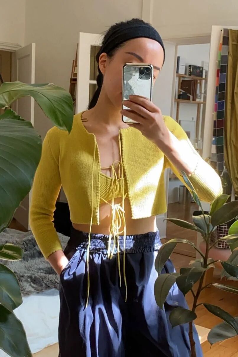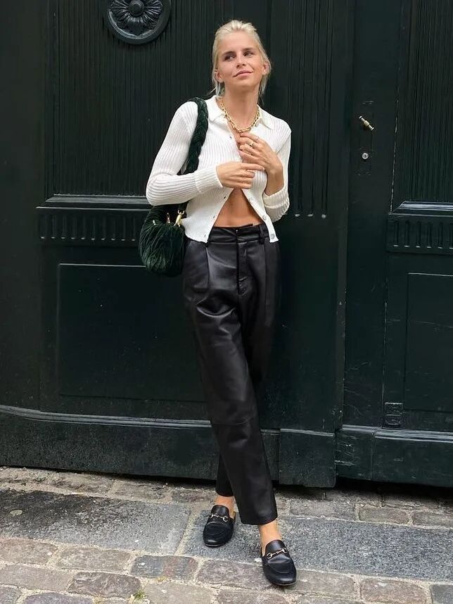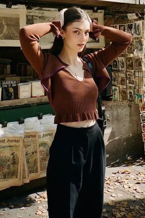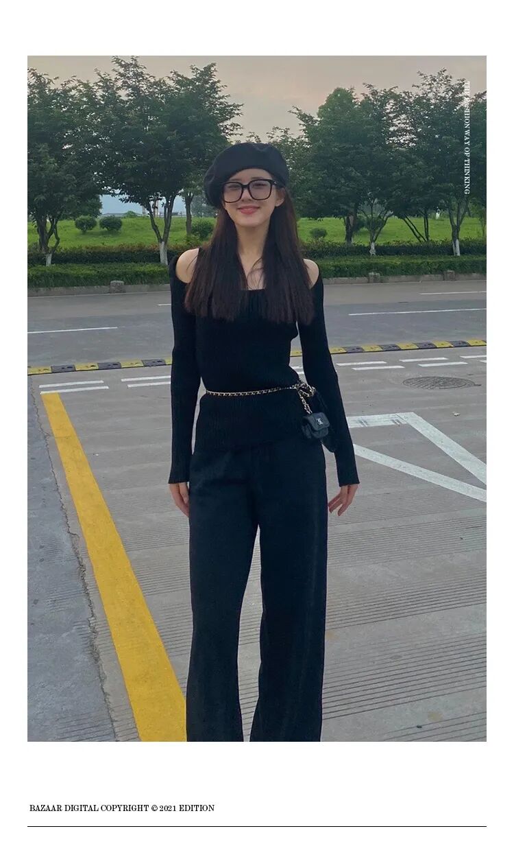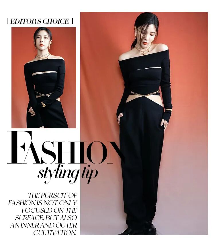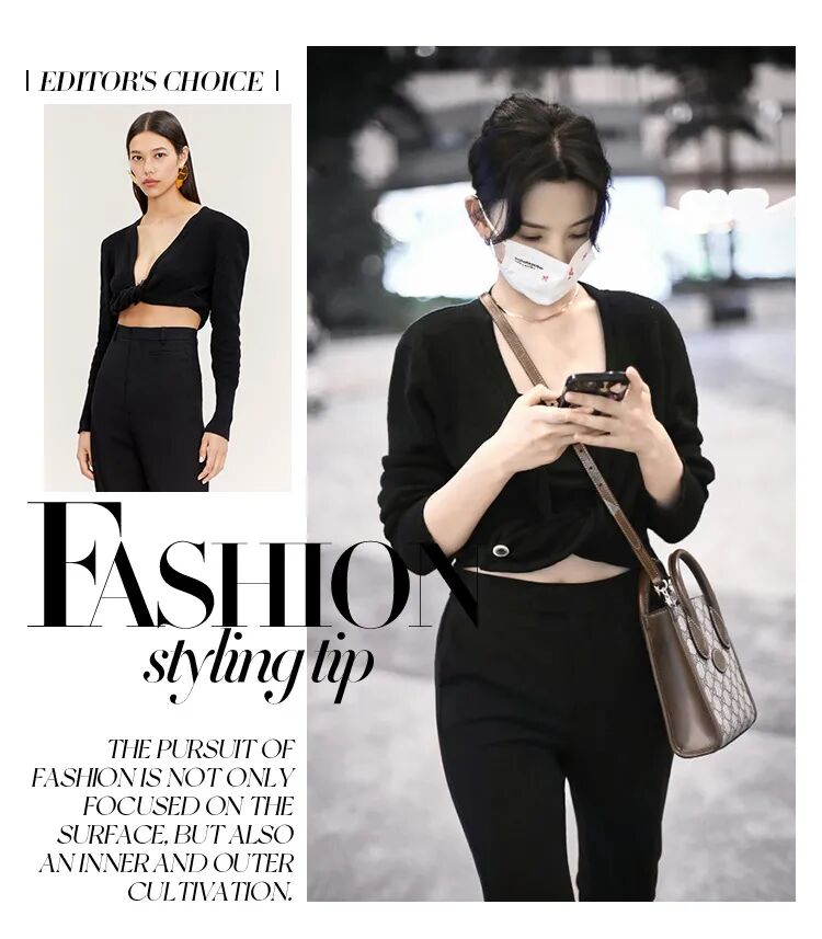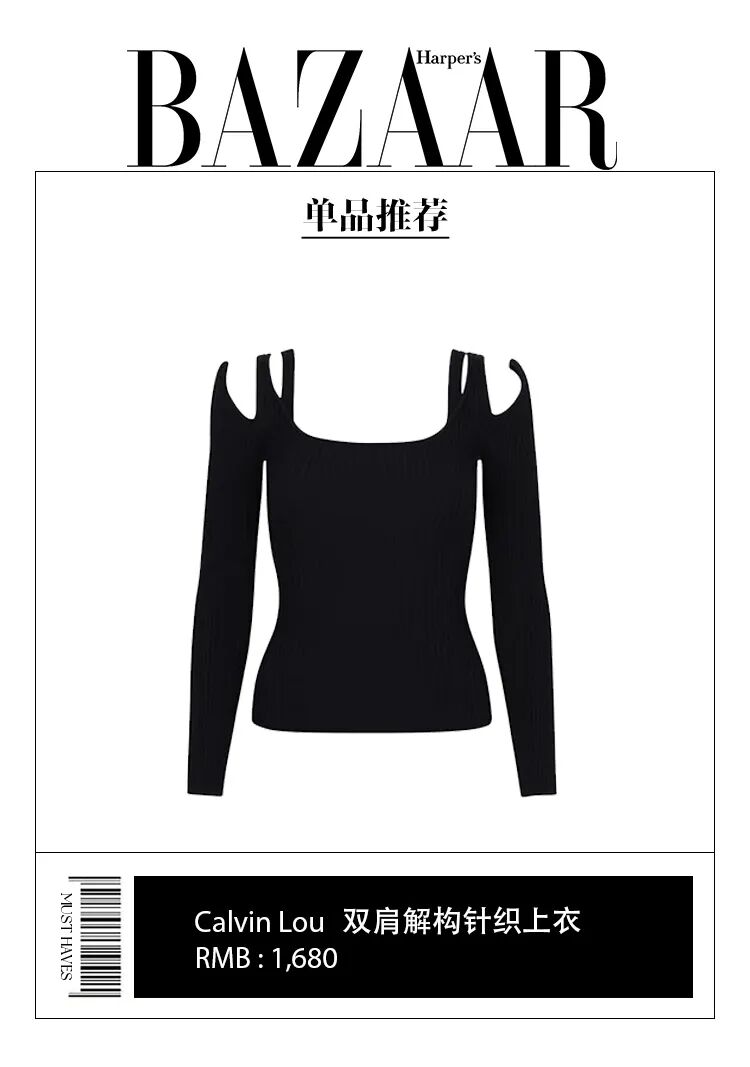 今年就连基础款裹身针织衫都不甘于普通,通过各个部位的挖空来变化成各种性感针织衫的样子。甜妹赵露思这件来自今年大火的中国设计师品牌Calvin Lou的黑色针织衫就利用肩部挖空的小细节,从视觉上打破了All black的严肃感,针织衫下摆也轻松地放出来,简单却恰到好处。