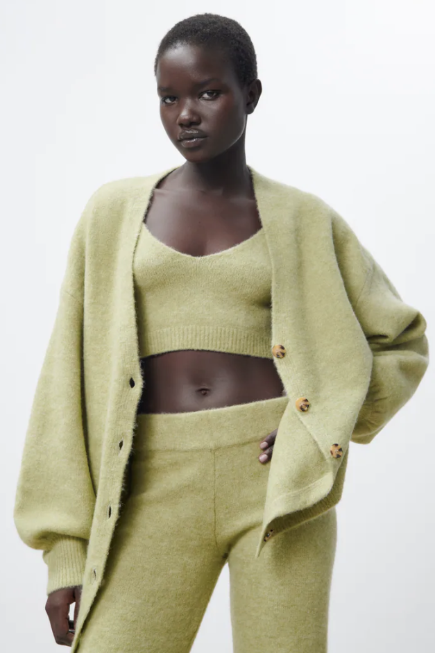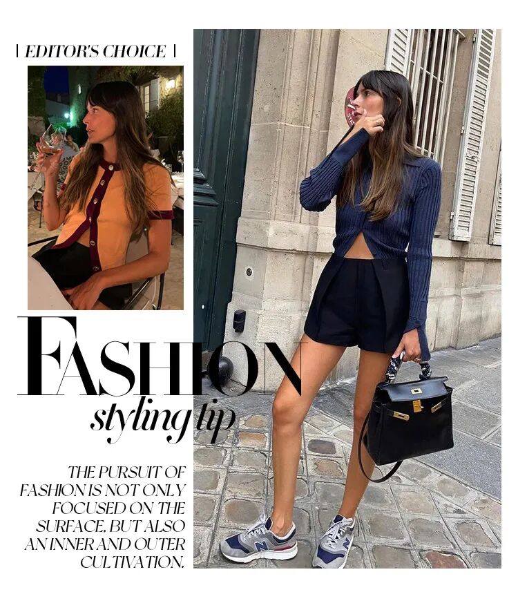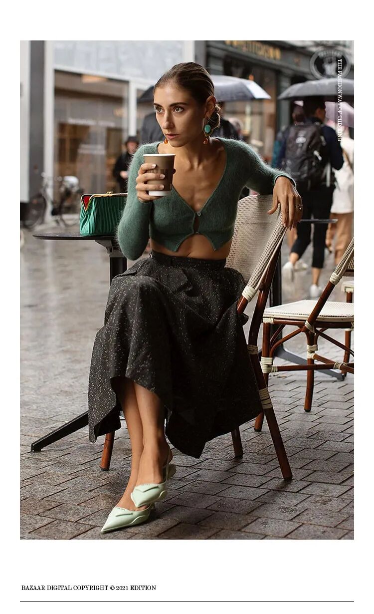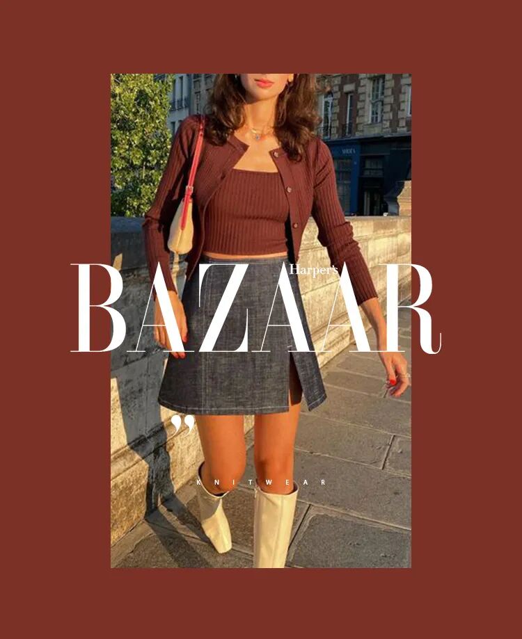 针织面料的特殊纹理让穿搭有一种居家般轻松的氛围感,针织的亲和力让露肤度较高的搭配有了节制的平衡。