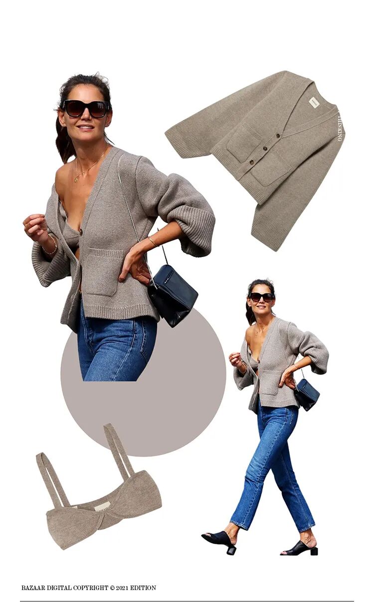 说起这个流行趋势,就不得不提起Katie Holmes当年用一套Khaite针织Bra+开衫的搭配,直接让品牌的针织Bra售罄,引领了一阵针织Bra的风潮。