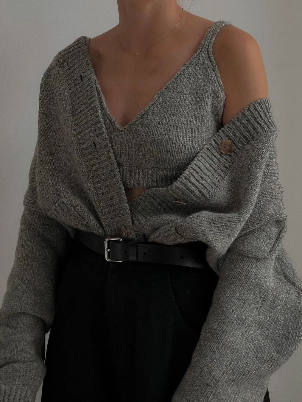胸前的镂空让针织这种材质多了一点性感的味道,明明系了扣子,隐约间却露出一点胸前的肌肤。天气冷时,外搭一件外套也不会显得臃肿。