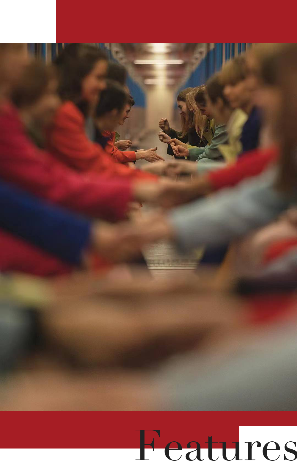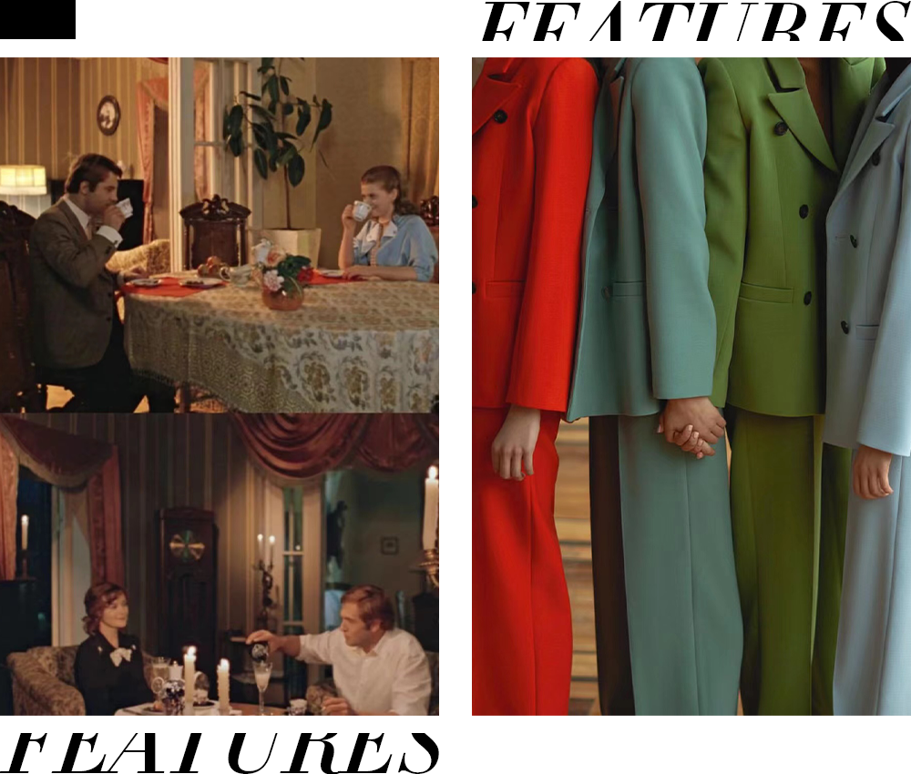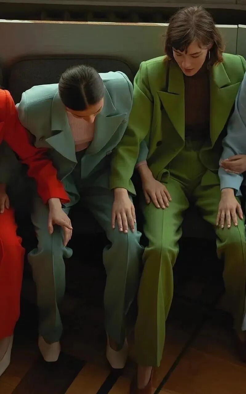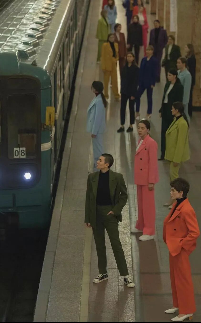 与其说是一场高级色彩的饕餮盛宴,不如说它是一部极富女性主义色彩的历史纪录片,尤其在俄罗斯摄影师Anatasia Lisitsyna的手下则更添了一份与世隔绝的浪漫情怀。他们刷新了人们对于西装的传统认知,另辟蹊径地聚集了50名女性身穿Lesyanebo的彩色西装,在莫斯科地铁站和剧院中呈现了一场别开生面的女性大片。在复古怀旧的场景下,人们错落有致地将身体舒展开来。浪漫与理性缠绕,是随手一张都震撼到足够能拿来当电影画面的程度。