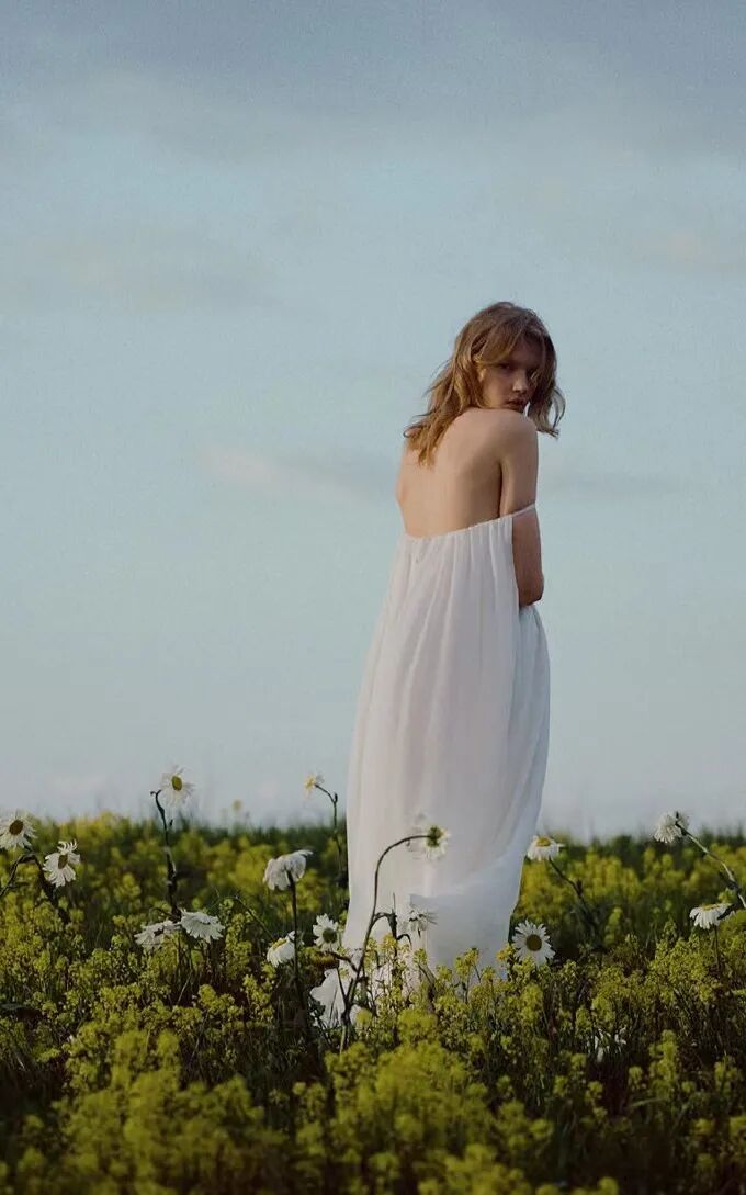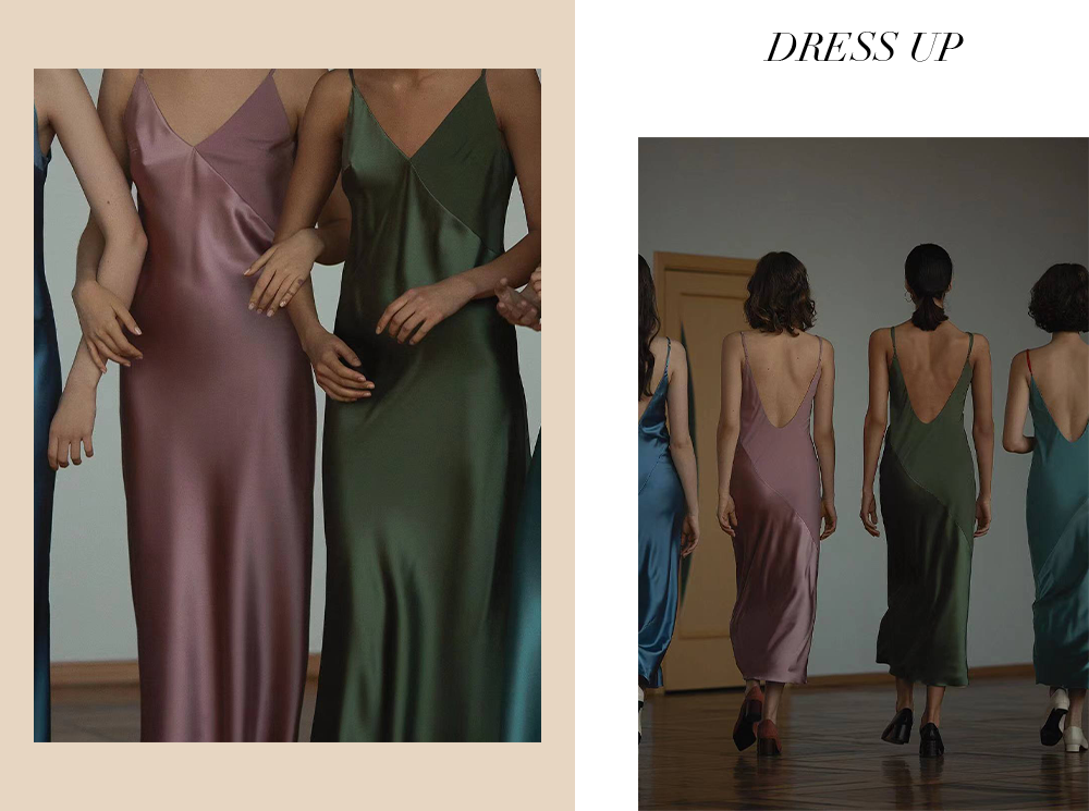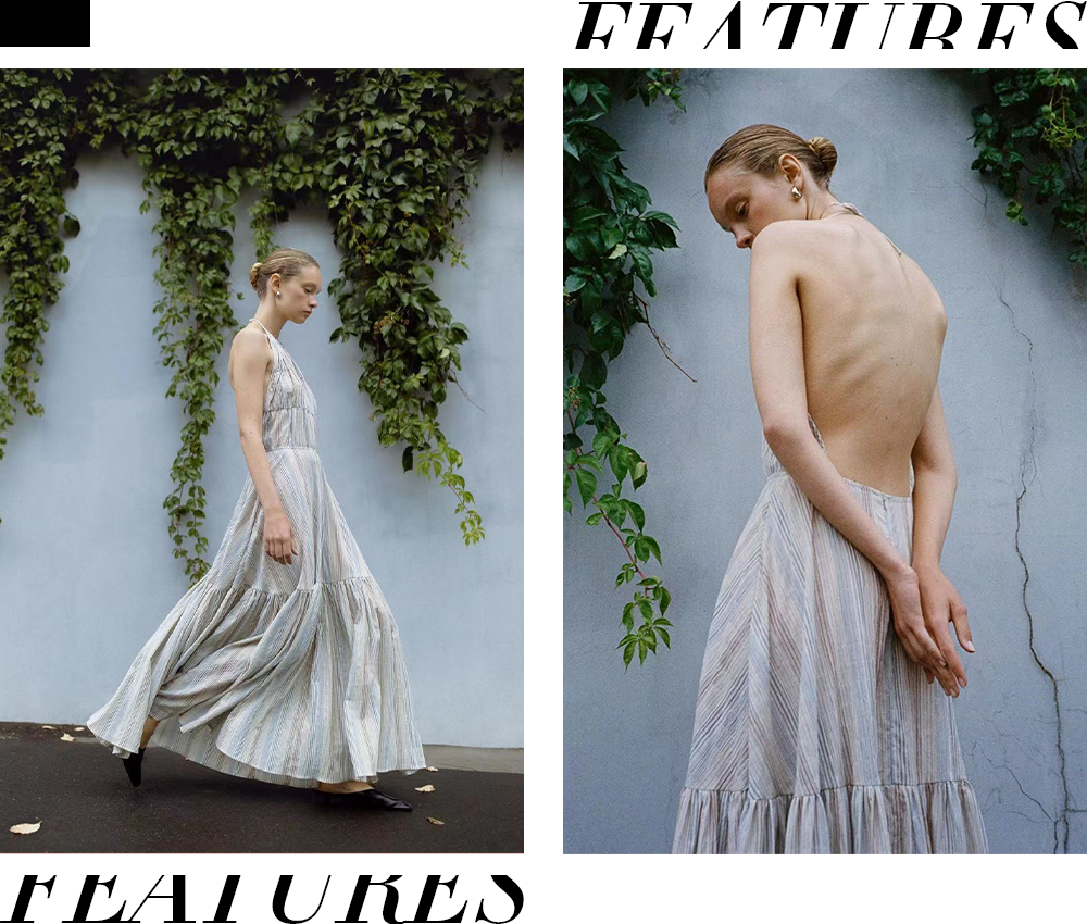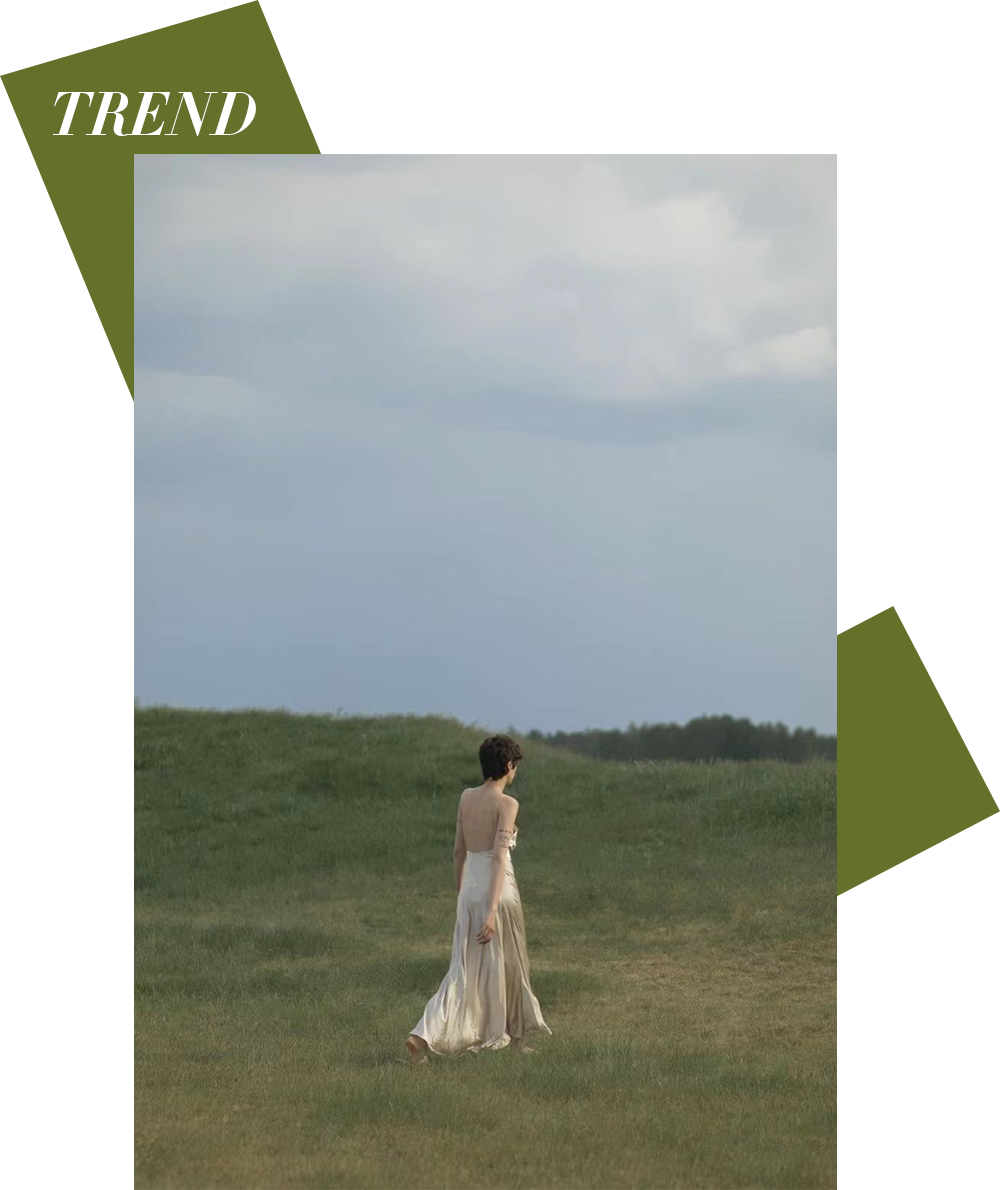 除了打动人心的品牌基调和唯美的画面,回归到服装本身,MY812更多的则是通过面料本身的光感和飘逸,恰到好处地注入时装之中。低饱和度的香槟色调能很好地将人与环境融合在一起,当风灌满整个裙摆,这种遗世独立的美无法不令人置身其中,想让人随着风翩翩起舞。当然,不只是品牌擅长的缎光丝绸吊带裙,在纯色连衣裙上它也可以为你提供很多选择。保留了舒适贴身的桑蚕丝面料,同时也增加了俄式印花元素、泡泡袖、系带等多种小巧思,细节满满又毫不用力的设计很是迷人,不失为夏日的绝佳选择。每一季lookbook的视觉展现,MY812都在彰显着品牌的用心和态度,即便款式并不繁多,但每一件都足够令人心动。