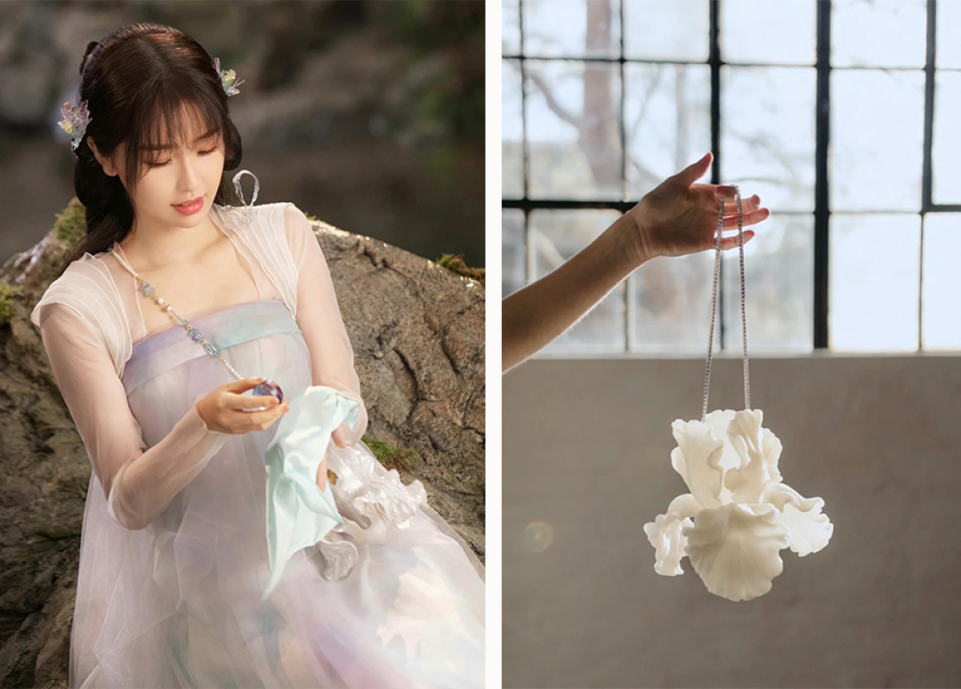 小兰花在剧中装奇幻流萤石的斜挎花朵包,是来自澳大利亚华裔新锐设计师的品牌Sheridan Tjhung,她运用3D打印技术将鸢尾花的精美与错综复杂体现得淋漓尽致,每片花瓣都能反射出丝绸般的质感,将现代设计的包包运用在仙侠剧里竟然毫无违和感。