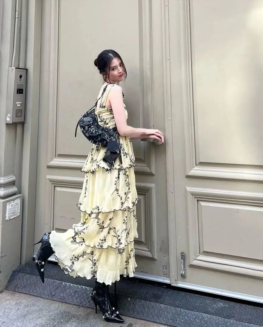 这也是因为韩素汐很擅用将一种元素搭配出多变的风格。一款金属穿孔皮包,韩素汐既可以用来配Ganni的粉嫩洋裙,凸显少女的清新灵动,也能用一袭肃穆的黑色调度风格,打造Girl Crush的神秘氛围。