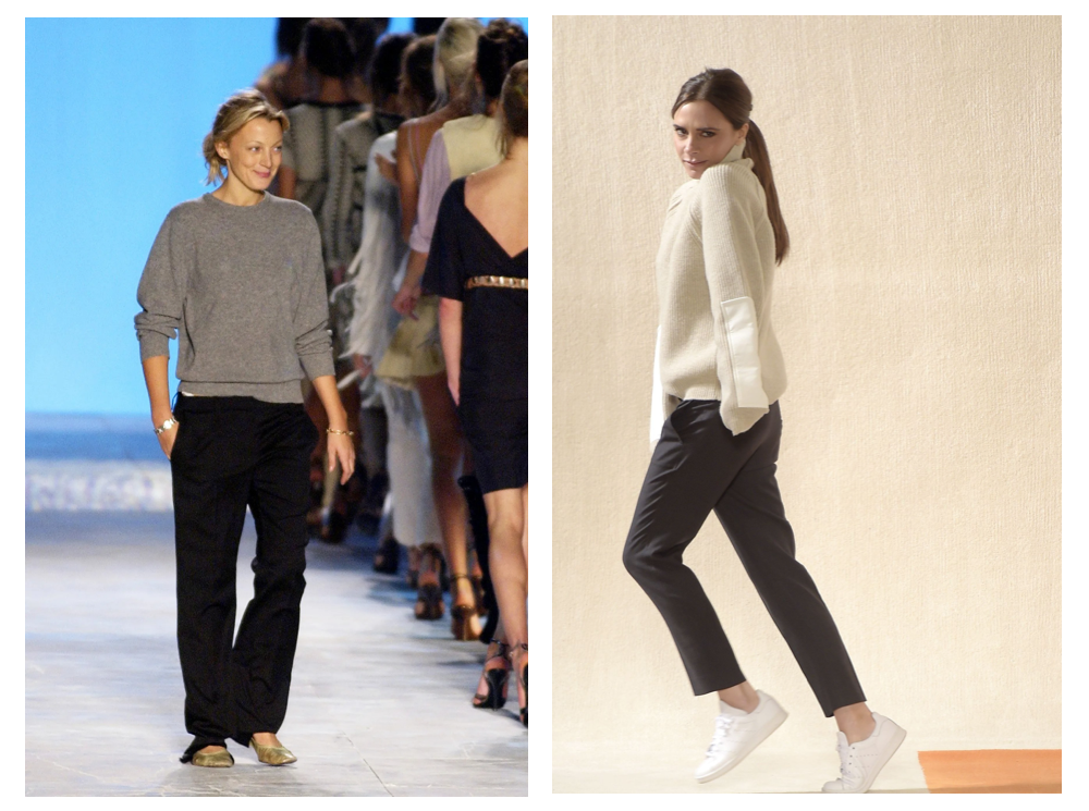 2002年10月,一件基础款灰色圆领针织上衣、直筒裤和平底鞋就完成了她在Chloé 2002春夏秀场谢幕的造型。这样的造型也成为了她的标志性形象,甚至引得鲜少穿平底鞋的Victoria Beckham的效仿。
