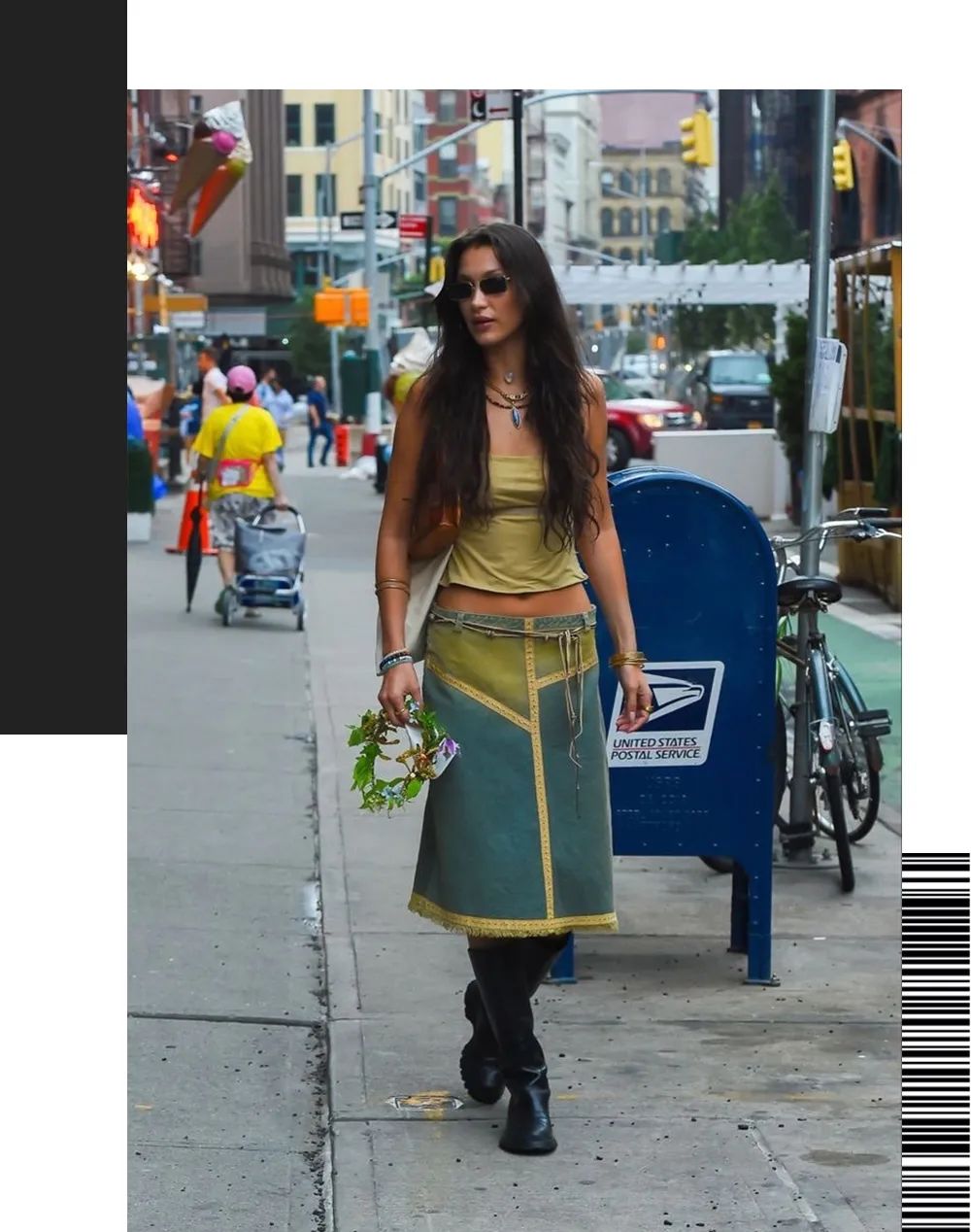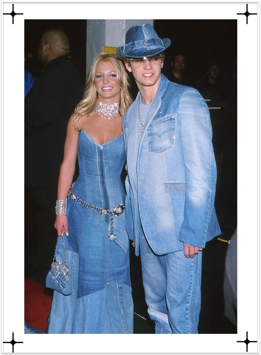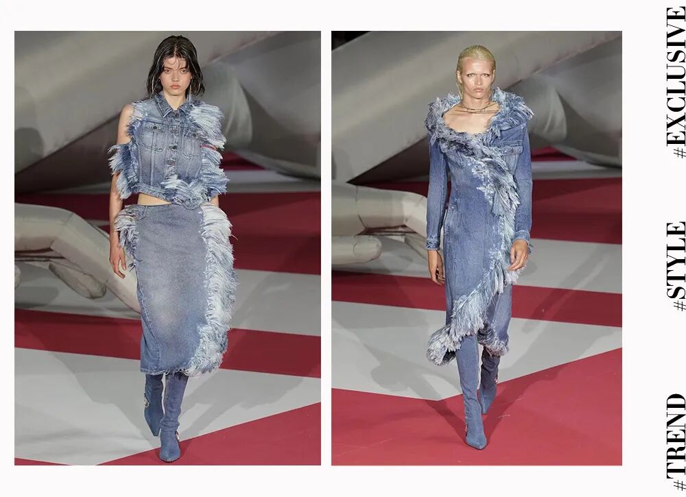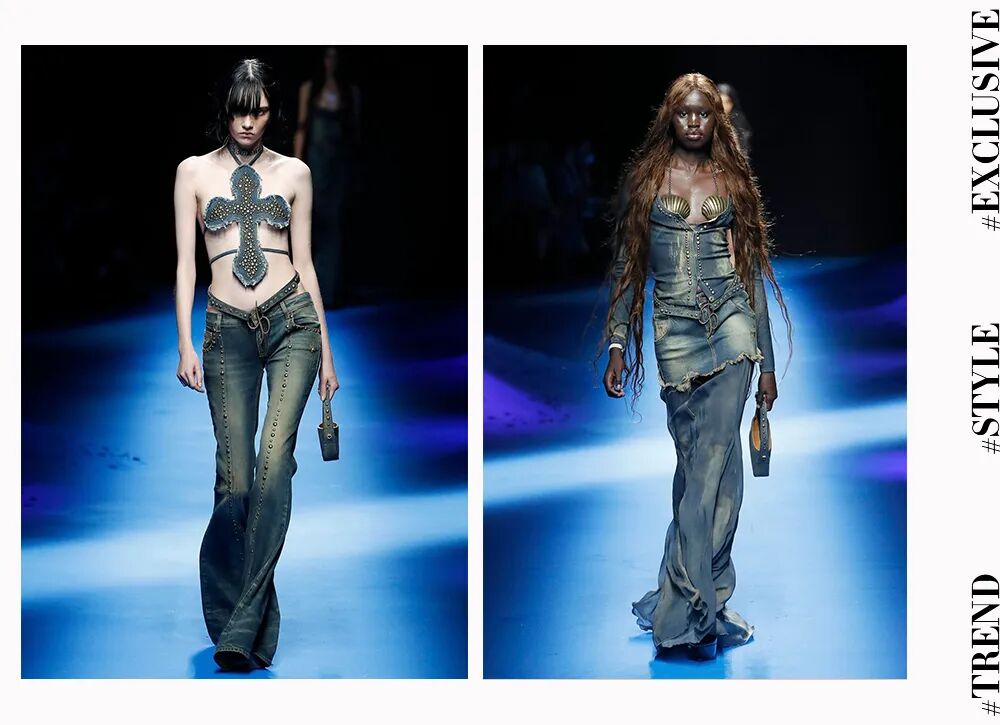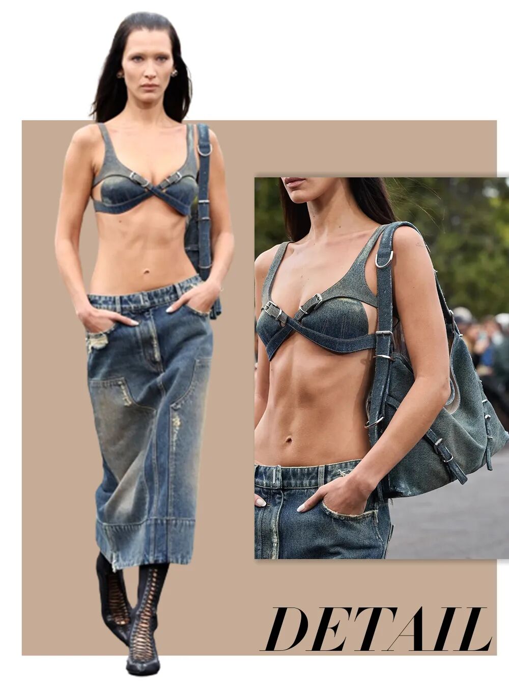 直到上个世纪50年代, 它开始与叛逆的青年联系在一起,在青年文化运动、嬉皮士反战游行、朋克风潮各种亚文化的推动下,让丹宁牛仔服饰逐渐演变成具有反主流标志的象征。至于它的时尚化,可以追溯到上个世纪70年代至80年代。1976年,Calvin Klein将牛仔裤带上秀场,也是首位这样做的品牌设计师。这一举动将其登上大雅之堂,并且在商业上获得了巨大的成功。直到1990年,Dior、Versace等众多高级时装品牌纷纷开始将丹宁牛仔裤纳入售卖的货架上。千禧年初,小甜甜布兰妮(Britney Spears)在2001年全美音乐奖(American Music Awards)的颁奖典礼上的惊天动地一举定义了接下来整个十年的时尚,成为了时尚史上的经典一幕。她与当时的男伴Justin Timberlake将Levi’s牛仔裤裁剪开,并remade制成了出席活动的礼服,这套红毯造型是当时的时尚界前所未有的尝试,让丹宁牛仔布在时尚界的地位直接有了质的飞跃。这组造型之后被众多Icon争相效仿,包括Katy Perry、维密天使 Devon Windsor、Kim Petras、和Dua Lipa。美剧《亢奋》中的Hunter Schafer身穿Rick Owen定制的牛仔鱼尾礼服出席奥斯卡名利场派对(Vanity Fair Party),像极了极具科技感的未来女战士。2022年的威尼斯电影节(Venice Film Festival), Jodie Turner-Smith的强势大女主造型来自Balmain定制的牛仔礼服裙,性感又克制。当洒脱不羁的牛仔遇上古灵精怪的Jean Paul Gaultier,两者的灵魂碰撞在2002年的春季高定系列中进行了完美的演绎,犹如上天注定好的天作之合。川久保玲的前助手(Junya Watanabe)运用丹宁牛仔面料进行天马行空的创作,把品牌肆意嚣张的不羁个性体现得淋漓尽致。一贯走精英路线的Ralph Lauren也紧跟这波热潮,可见大量的丹宁牛仔在2003春夏的秀场上崭露头角,其中的牛仔鱼尾长裙放到今天来看依旧很入时。千禧年前后是讲究日常与高级时装的混搭多元时代,可见把亲民的牛仔面料融入到高级成衣设计是一种多么低调的浪漫反叛。从去年开始,便是铺天盖地的金属感元素、PVC元素、水钻元素、蝴蝶元素、高饱和度的明亮色彩和低腰款喇叭牛仔裤充斥着整个Z世代人群,配上甜度超标的千禧年妆容是妥妥的“辣妹标配”没错了。从今年的趋势来看Y2K这阵风潮还得延续,但一改以往甜美、性感、热辣的形象,在此基础上融入了末日废土元素,既然是废土风,那么颓废感色系则是营造氛围感的关键,黑、白、灰和大地色是精髓,呈现出叛逆朋克的风格。牛仔服装则摒弃了常规色系,在工艺上通过做旧水洗、未来感金属色调涂层、褪色染色等处理,呈现出沙土质感的黄绿色系,宛如游荡在虚拟的未来世界里的先锋战士,诠释出了一种别具一格的野性美。若Y2K是诠释着人们对未来世界的美好期待,那「末日废土风」则表达了在高科技背后,大众对遭到肆意破坏的自然环境的担忧而导致对末日来临的幻想,从而形成的一种时尚风格。街拍女王Bella Hadid将黄绿色吊带、同色系做旧牛仔低腰款过膝长裙,与长靴进行搭配,塑造出一种既迷人又危险的都市女郎形象。过膝长裙频繁出现在各路明星潮人们的街拍造型中, 预示着这将成为2023年的潮流风向标。选择低腰款式的过膝长裙,搭配上同色系的复古皮带作为整套look的点缀,细节是让时髦翻倍的秘密武器。牛仔+牛仔这种搭配公式也是众多明星icon钟爱的造型,将相似色调的牛仔单品相结合,炫酷拽姐和性感辣妹肆意切换。