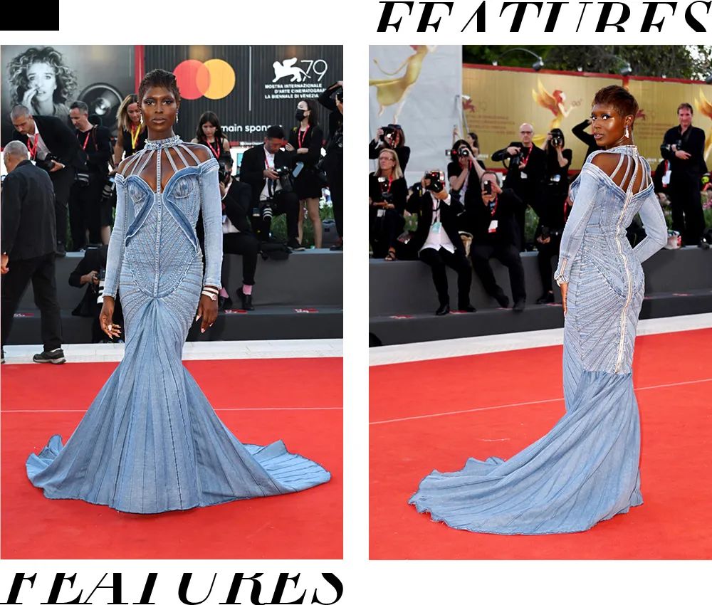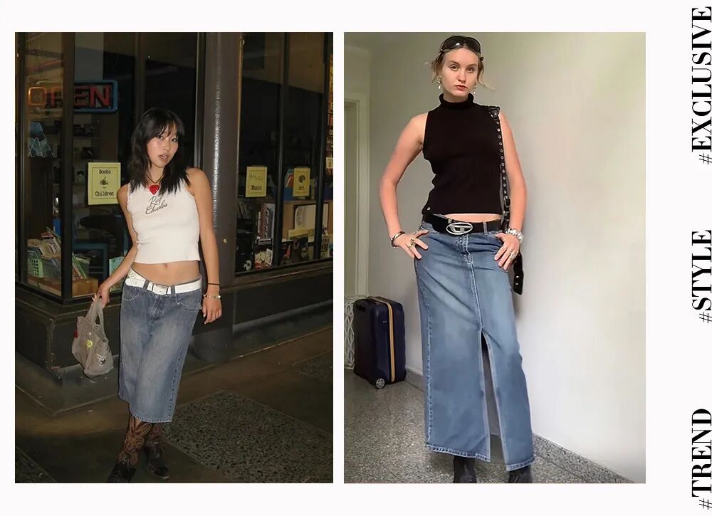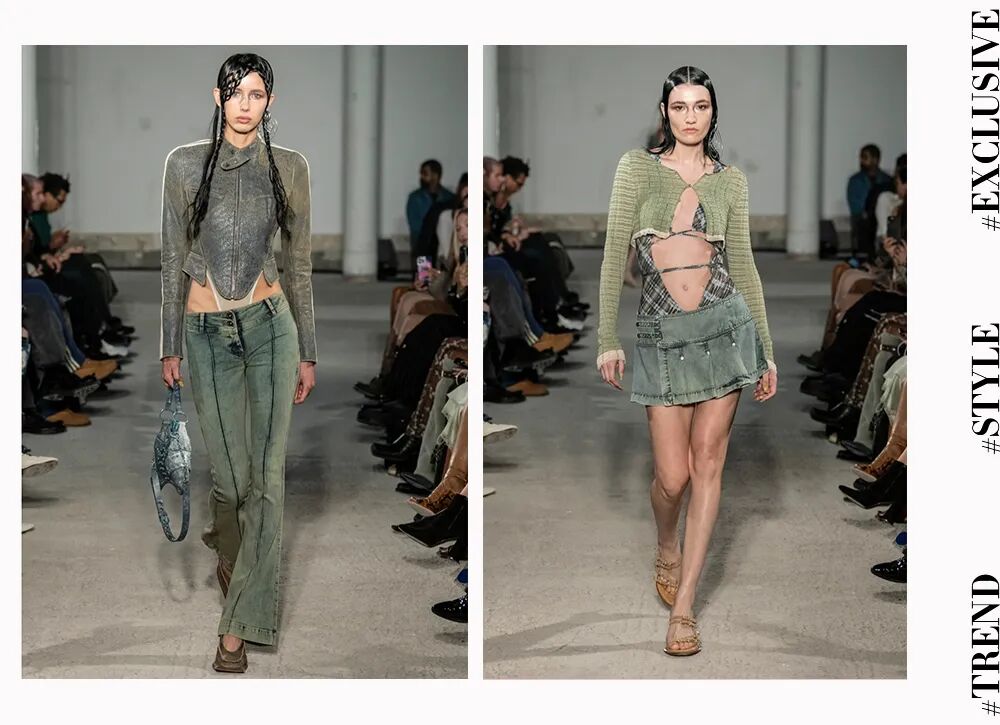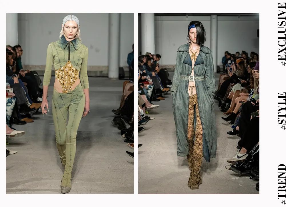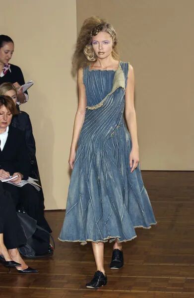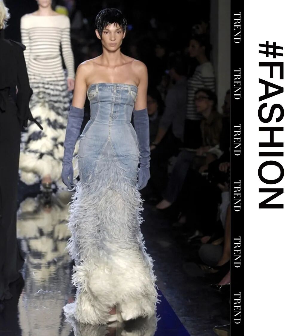直到上个世纪50年代, 它开始与叛逆的青年联系在一起,在青年文化运动、嬉皮士反战游行、朋克风潮各种亚文化的推动下,让丹宁牛仔服饰逐渐演变成具有反主流标志的象征。至于它的时尚化,可以追溯到上个世纪70年代至80年代。1976年,Calvin Klein将牛仔裤带上秀场,也是首位这样做的品牌设计师。这一举动将其登上大雅之堂,并且在商业上获得了巨大的成功。直到1990年,Dior、Versace等众多高级时装品牌纷纷开始将丹宁牛仔裤纳入售卖的货架上。千禧年初,小甜甜布兰妮(Britney Spears)在2001年全美音乐奖(American Music Awards)的颁奖典礼上的惊天动地一举定义了接下来整个十年的时尚,成为了时尚史上的经典一幕。她与当时的男伴Justin Timberlake将Levi’s牛仔裤裁剪开,并remade制成了出席活动的礼服,这套红毯造型是当时的时尚界前所未有的尝试,让丹宁牛仔布在时尚界的地位直接有了质的飞跃。这组造型之后被众多Icon争相效仿,包括Katy Perry、维密天使 Devon Windsor、Kim Petras、和Dua Lipa。美剧《亢奋》中的Hunter Schafer身穿Rick Owen定制的牛仔鱼尾礼服出席奥斯卡名利场派对(Vanity Fair Party),像极了极具科技感的未来女战士。2022年的威尼斯电影节(Venice Film Festival), Jodie Turner-Smith的强势大女主造型来自Balmain定制的牛仔礼服裙,性感又克制。当洒脱不羁的牛仔遇上古灵精怪的Jean Paul Gaultier,两者的灵魂碰撞在2002年的春季高定系列中进行了完美的演绎,犹如上天注定好的天作之合。川久保玲的前助手(Junya Watanabe)运用丹宁牛仔面料进行天马行空的创作,把品牌肆意嚣张的不羁个性体现得淋漓尽致。一贯走精英路线的Ralph Lauren也紧跟这波热潮,可见大量的丹宁牛仔在2003春夏的秀场上崭露头角,其中的牛仔鱼尾长裙放到今天来看依旧很入时。千禧年前后是讲究日常与高级时装的混搭多元时代,可见把亲民的牛仔面料融入到高级成衣设计是一种多么低调的浪漫反叛。从去年开始,便是铺天盖地的金属感元素、PVC元素、水钻元素、蝴蝶元素、高饱和度的明亮色彩和低腰款喇叭牛仔裤充斥着整个Z世代人群,配上甜度超标的千禧年妆容是妥妥的“辣妹标配”没错了。从今年的趋势来看Y2K这阵风潮还得延续,但一改以往甜美、性感、热辣的形象,在此基础上融入了末日废土元素,既然是废土风,那么颓废感色系则是营造氛围感的关键,黑、白、灰和大地色是精髓,呈现出叛逆朋克的风格。牛仔服装则摒弃了常规色系,在工艺上通过做旧水洗、未来感金属色调涂层、褪色染色等处理,呈现出沙土质感的黄绿色系,宛如游荡在虚拟的未来世界里的先锋战士,诠释出了一种别具一格的野性美。若Y2K是诠释着人们对未来世界的美好期待,那「末日废土风」则表达了在高科技背后,大众对遭到肆意破坏的自然环境的担忧而导致对末日来临的幻想,从而形成的一种时尚风格。街拍女王Bella Hadid将黄绿色吊带、同色系做旧牛仔低腰款过膝长裙,与长靴进行搭配,塑造出一种既迷人又危险的都市女郎形象。过膝长裙频繁出现在各路明星潮人们的街拍造型中, 预示着这将成为2023年的潮流风向标。选择低腰款式的过膝长裙,搭配上同色系的复古皮带作为整套look的点缀,细节是让时髦翻倍的秘密武器。牛仔+牛仔这种搭配公式也是众多明星icon钟爱的造型,将相似色调的牛仔单品相结合,炫酷拽姐和性感辣妹肆意切换。