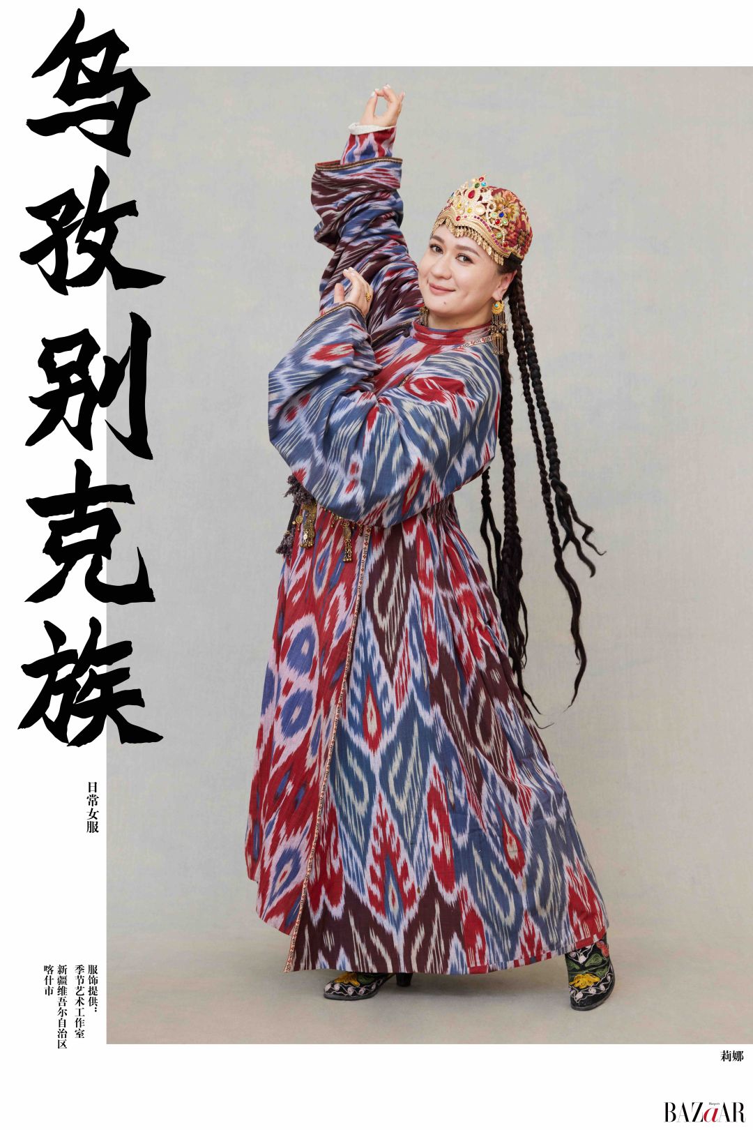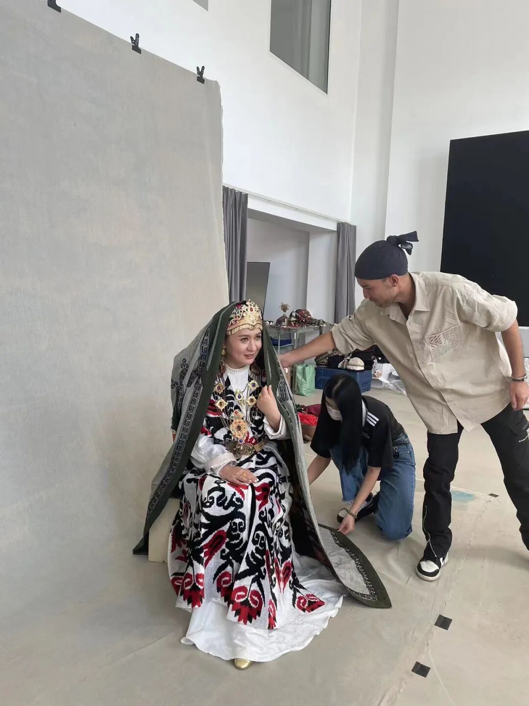 莉娜在这次拍摄中身着乌孜别克族日常女服为了配合这次拍摄,我早早地将头发染回了本身的颜色,没想到因为疫情和服装筹备等问题,拍摄再三被延期。那段时间其实我也很担心,因为乌孜别克族的服装很少,不知道摄制组有没有能力找到合适的衣服。直到在拍摄现场看见新疆非常有名的文化品牌“入迷文创”主理人麦吾兰老师在做服饰指导,我就非常有信心了,他可是新疆数一数二的艺术家,他的一些光影作品和服饰搭配一直很吸引我,有机会能和他合作真的是出乎意料的惊喜。因为共同对新疆服饰非常了解,这次我们俩的完成度也很高。