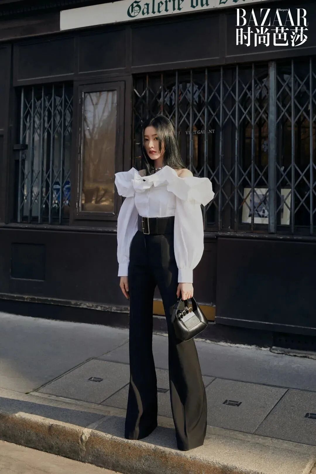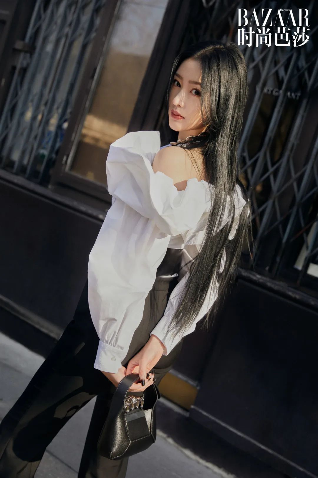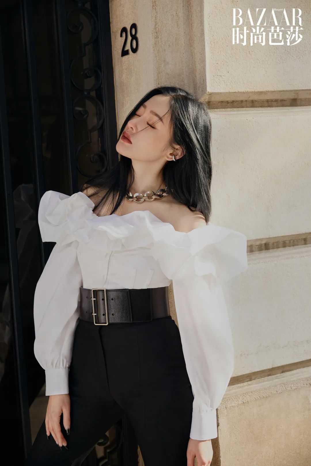 黑色嵌花针织紧身衣、橘色皮革不对称垂褶半裙、The Shard针织靴及The Jewelled Hobo迷你指环包均来自Alexander McQueen 2023春夏女装系列。街头即秀场,承载张天爱日常之美的多元表达。黑色嵌花针织紧身衣,完美呈现形体之美,诠释时尚张力。橘色皮革不对称垂褶半裙,力量感与未来感交织,展示着她“从不妥协”的处世哲学。极简与繁复,不同在于对“留白”的定义。有序堆叠美感的另一面,是克制的表达,在虚实之间构建语言。张天爱的美,自带灵气,还有一种独特的疏离感。面对镜头,笃定从容,从不给生活设限。白色露肩茧形衣袖衬衫搭配紧身喇叭裤,率性简约,柔美与决断兼具。孔眼颈链、复古银色金属耳夹点缀造型,金属质感,释放坚不可摧的魅力磁场,映照内心深处的坚定果敢。美是多元共生,跨越时空维度,与当下对话,构建日常生活形态。力量源自内心真我,它既创造美、雕刻美、同时也是美本身。美与力量既是创新与传统融合并置的时装语言,也是通透率性、无畏真我的态度表达。我们拥抱美与力量,内外相融,无论微小或宏大,都是与当下最有力的联结。