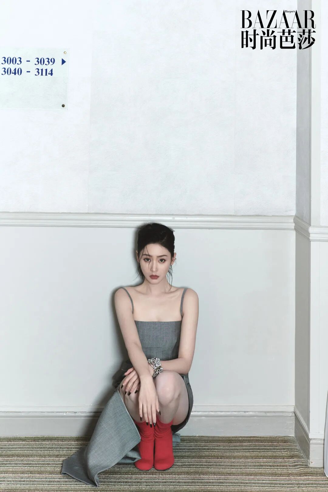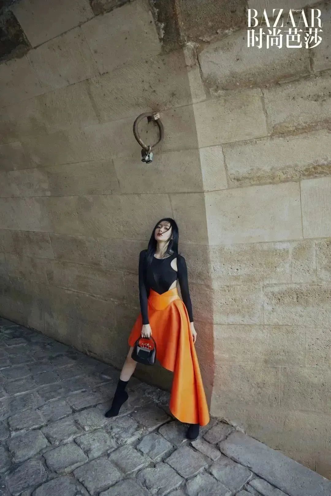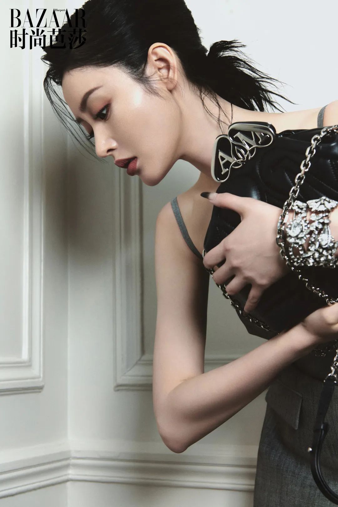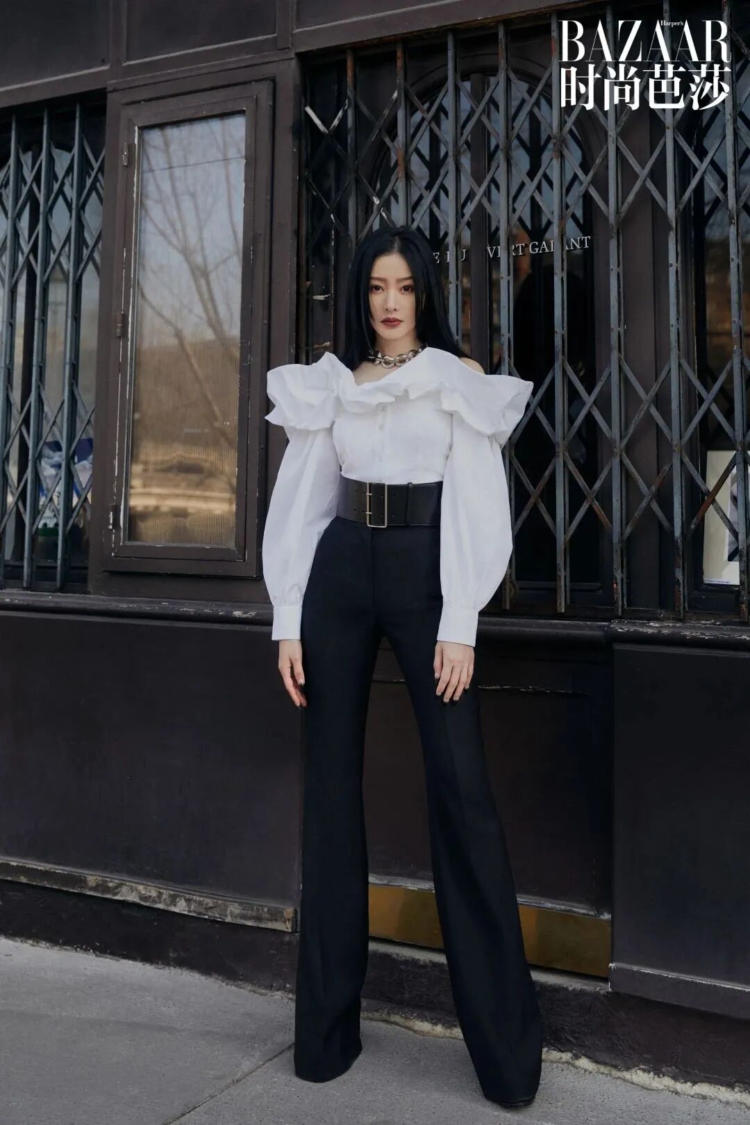 黑色嵌花针织紧身衣、橘色皮革不对称垂褶半裙、The Shard针织靴及The Jewelled Hobo迷你指环包均来自Alexander McQueen 2023春夏女装系列。街头即秀场,承载张天爱日常之美的多元表达。黑色嵌花针织紧身衣,完美呈现形体之美,诠释时尚张力。橘色皮革不对称垂褶半裙,力量感与未来感交织,展示着她“从不妥协”的处世哲学。极简与繁复,不同在于对“留白”的定义。有序堆叠美感的另一面,是克制的表达,在虚实之间构建语言。张天爱的美,自带灵气,还有一种独特的疏离感。面对镜头,笃定从容,从不给生活设限。白色露肩茧形衣袖衬衫搭配紧身喇叭裤,率性简约,柔美与决断兼具。孔眼颈链、复古银色金属耳夹点缀造型,金属质感,释放坚不可摧的魅力磁场,映照内心深处的坚定果敢。美是多元共生,跨越时空维度,与当下对话,构建日常生活形态。力量源自内心真我,它既创造美、雕刻美、同时也是美本身。美与力量既是创新与传统融合并置的时装语言,也是通透率性、无畏真我的态度表达。我们拥抱美与力量,内外相融,无论微小或宏大,都是与当下最有力的联结。