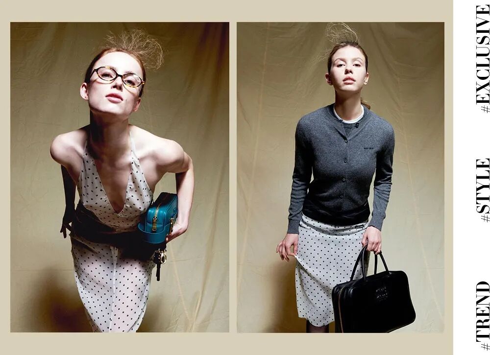 Miuccia手下的Miu Miu女孩戴着玳瑁眼镜,穿着扣子系到第一颗的针织开衫,顶着乱糟糟的头发,这不正像是小妞电影中还未蜕变的女主角。