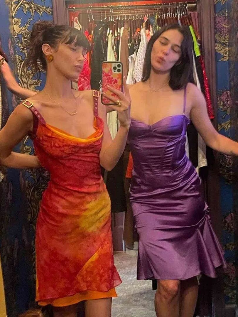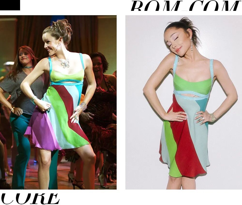 A妹上身的这条Versace拼色连衣裙灵感就来自于《女孩梦三十》,大胆的色彩组合即使以现在的审美标准来看也不落俗套。女主角搭配的蝴蝶项链更是精准踩中如今Y2K的流行元素。